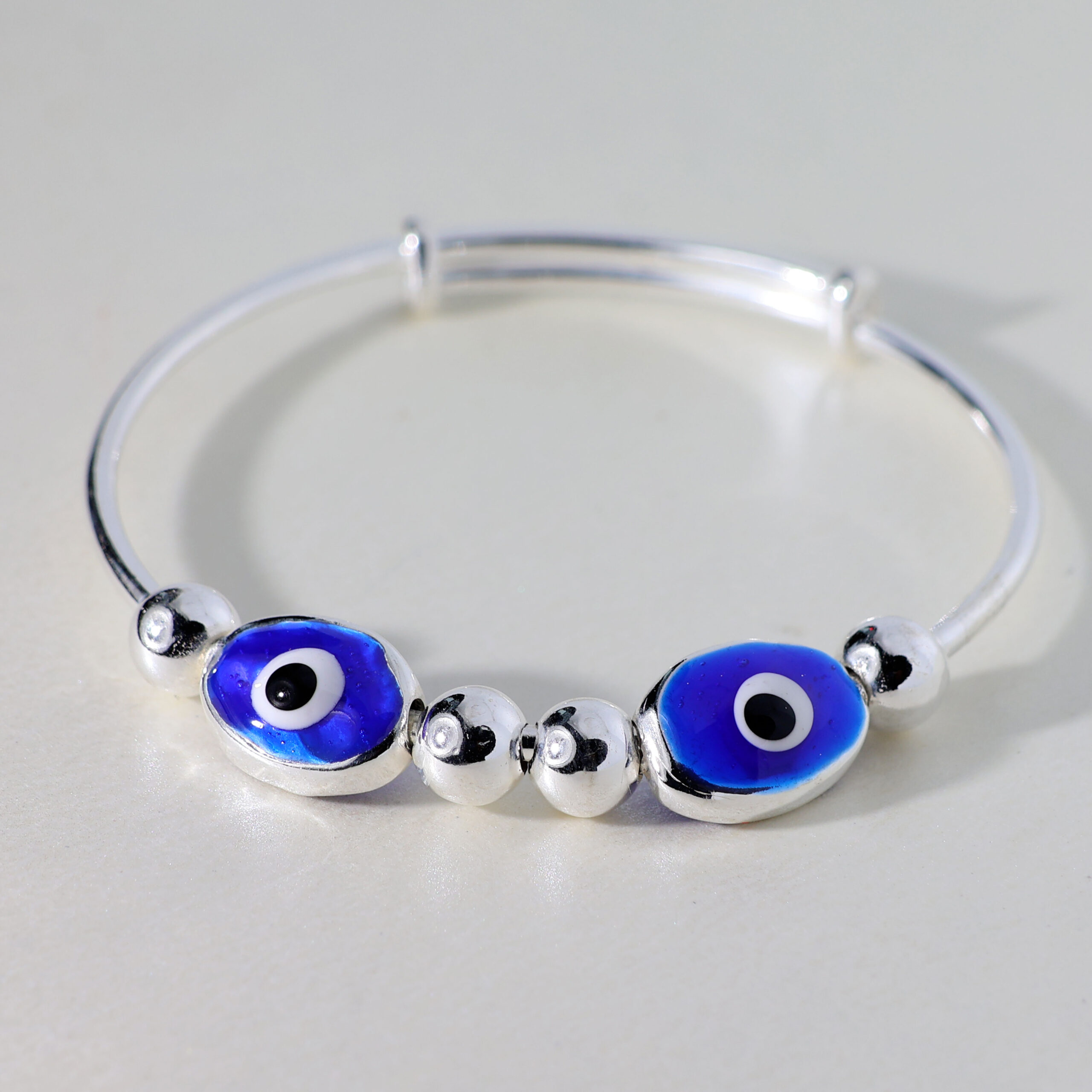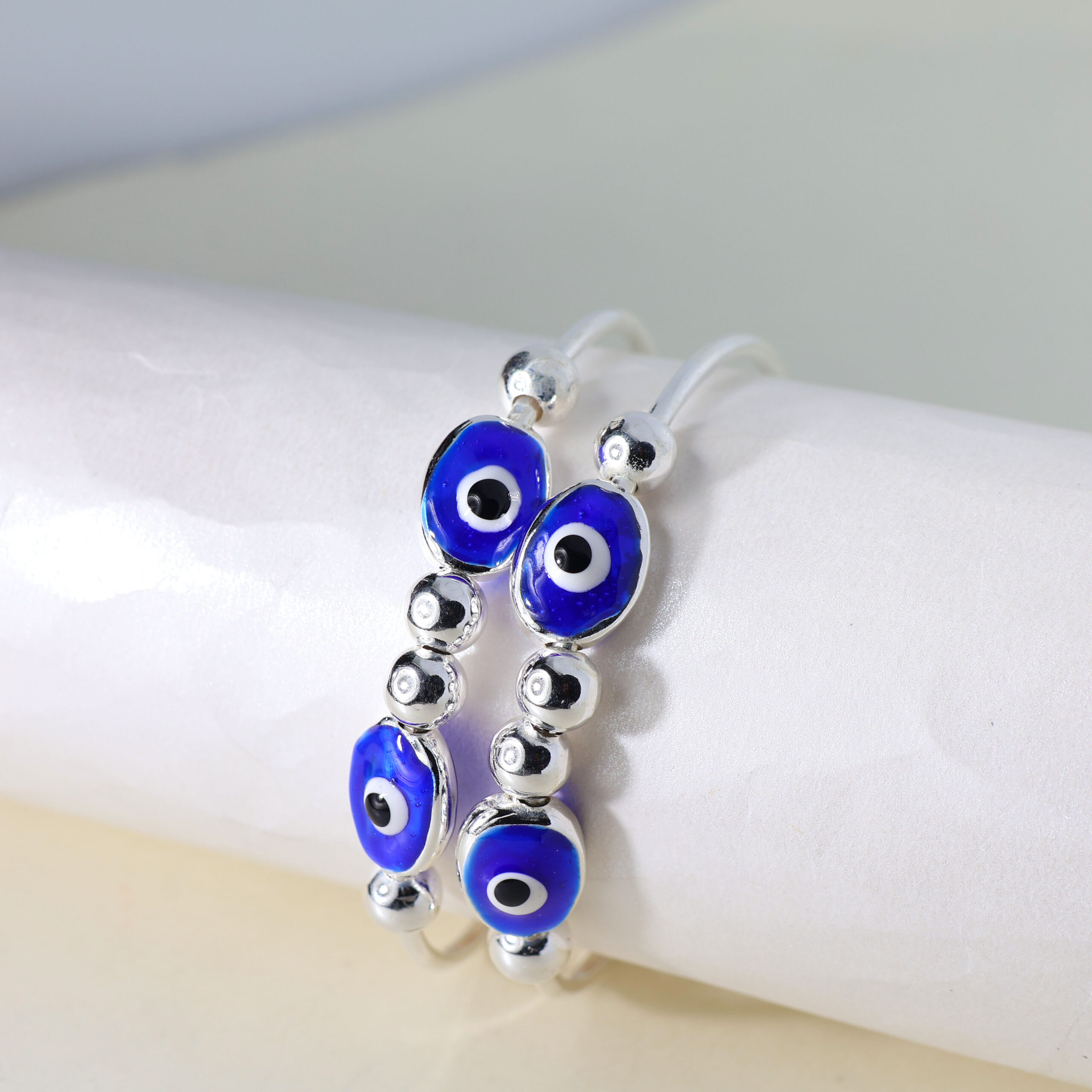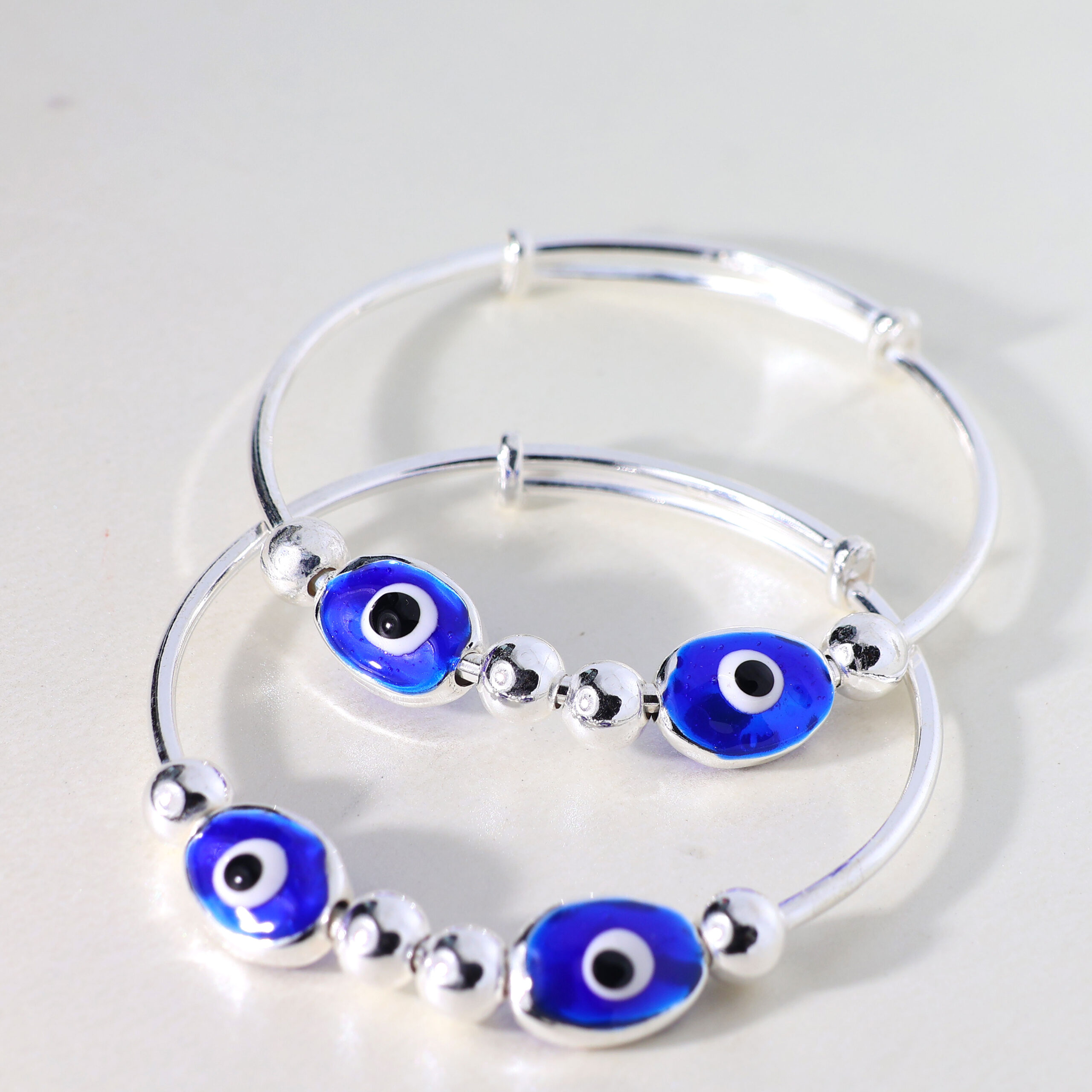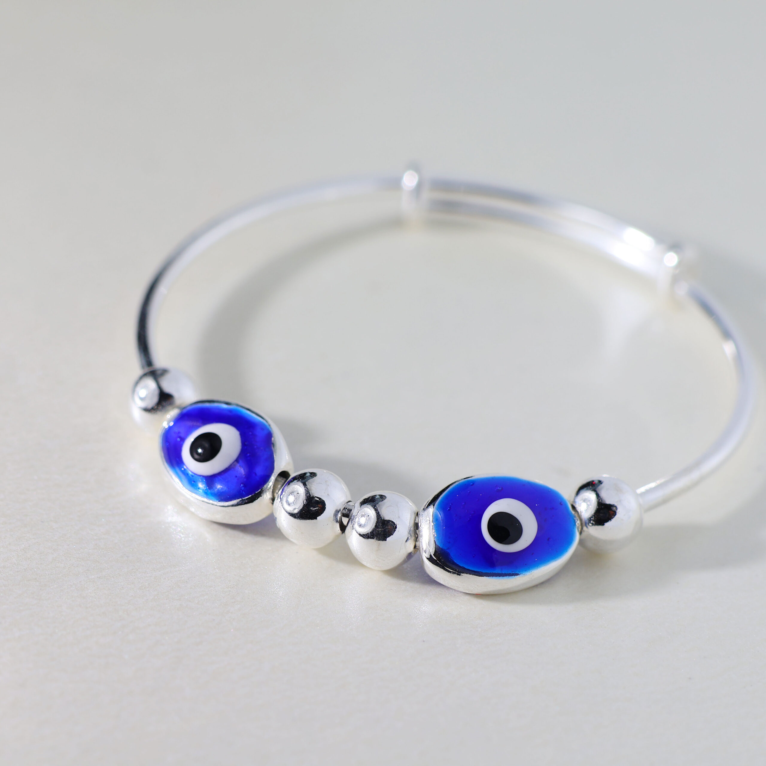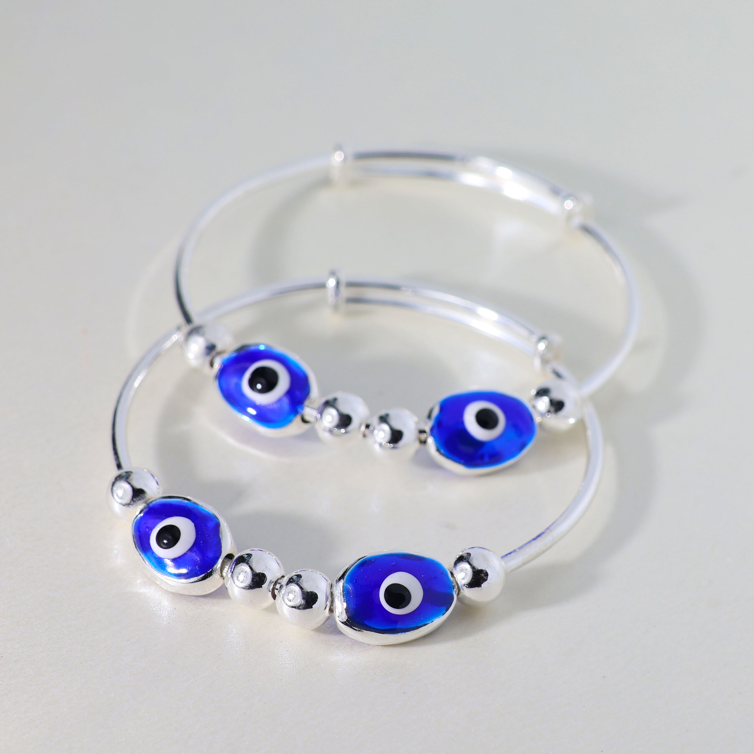 Shimmering blue evil eye beads meet polished silver balls in a balanced, protective form — perfect for baby wrists and heartfelt blessings.