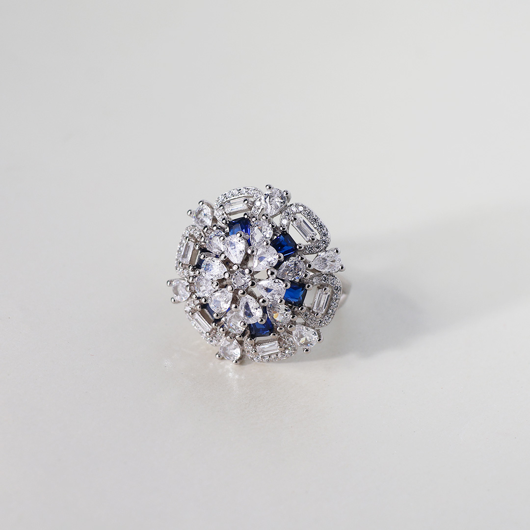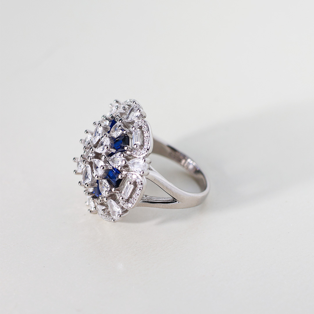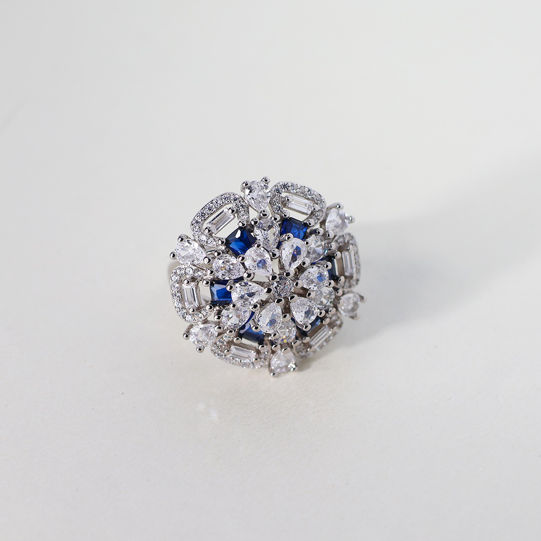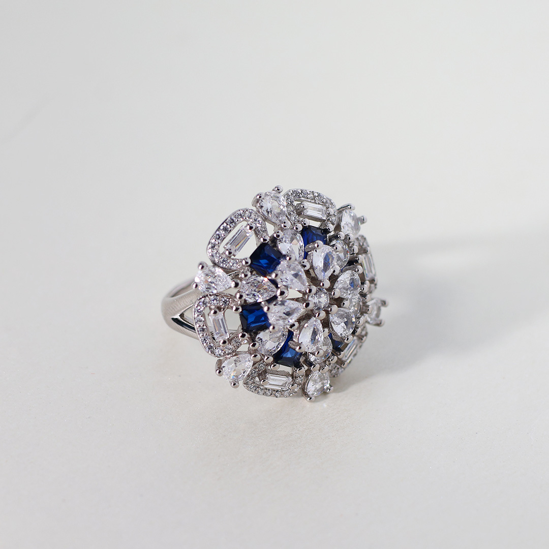 • Vivid Blue Sapphires: Interspersed among the clear stones are vibrant blue sapphires. These sapphires provide a striking contrast in color and add a touch of regal elegance to the ring.
