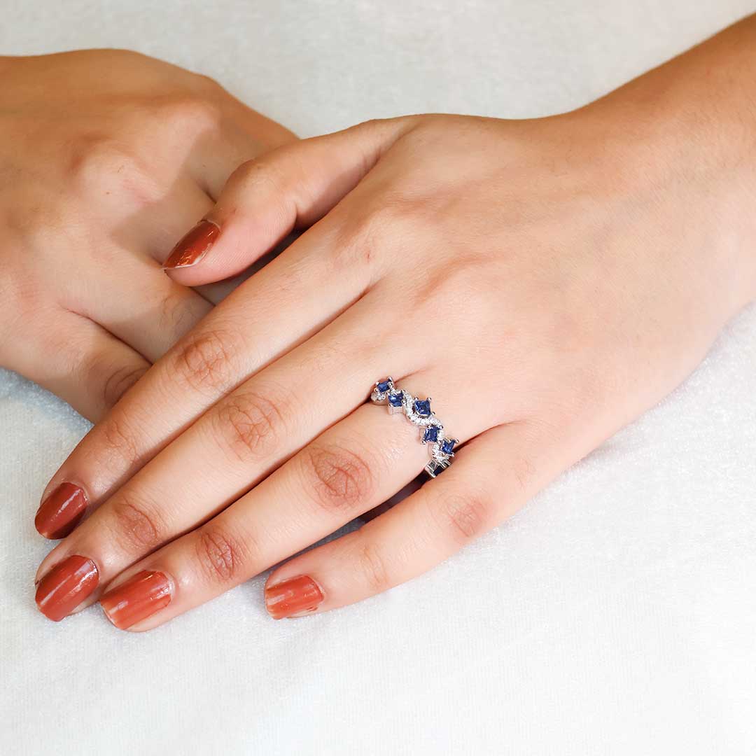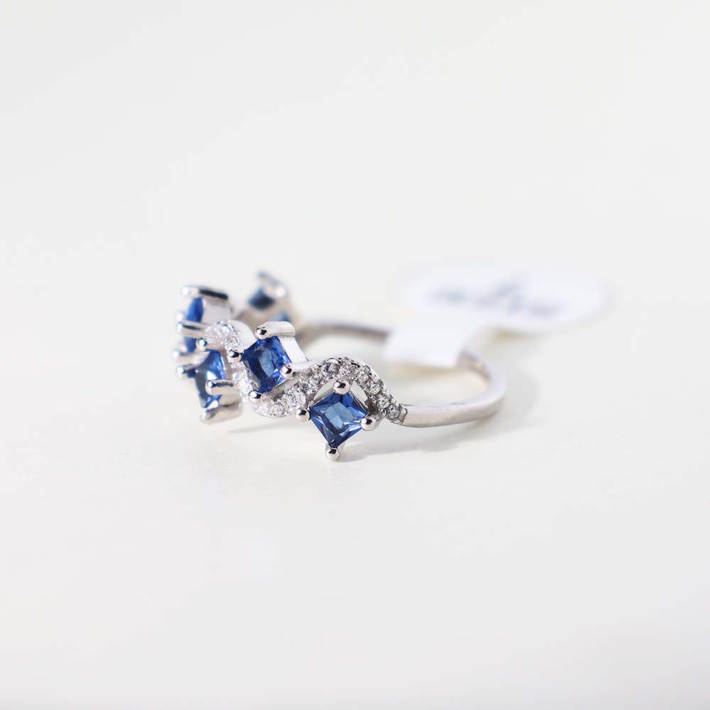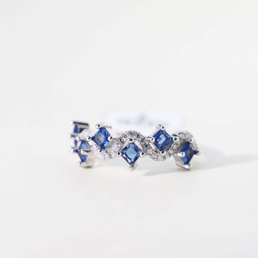 Alternating sapphire-like stones and radiant crystals sparkle on a slim silver band, creating a minimal yet unforgettable design.