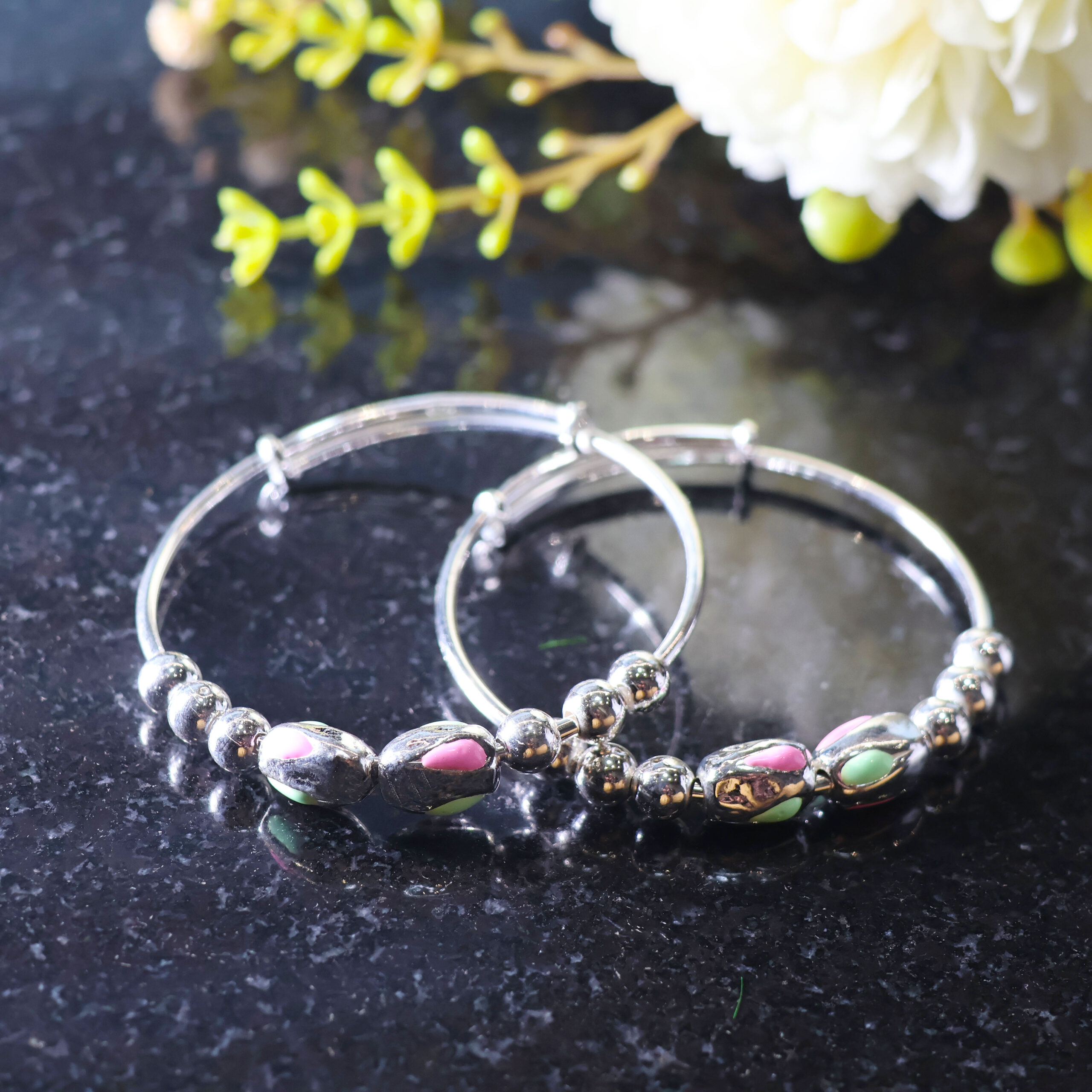 Crafted in polished silver and accented with soft pink and green petals, these kangans gently wrap your baby’s wrist in comfort and color.