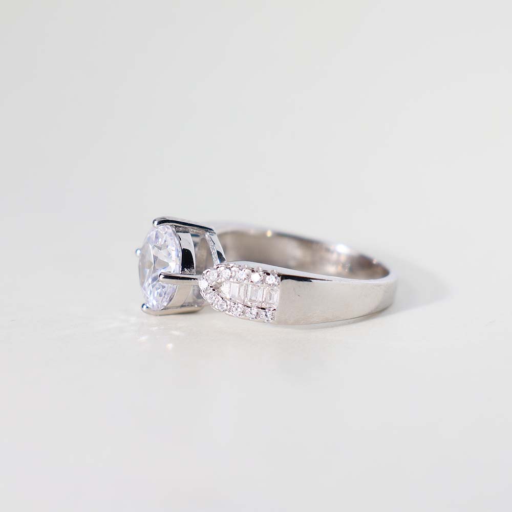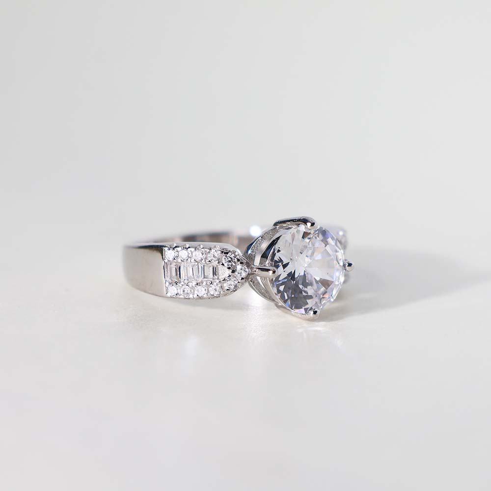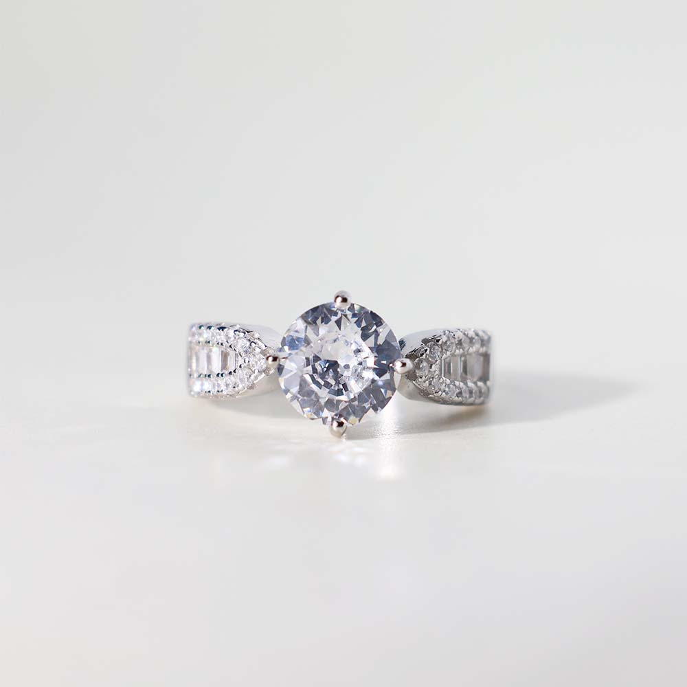 The ring features a round, clear stone as its prominent center stone.