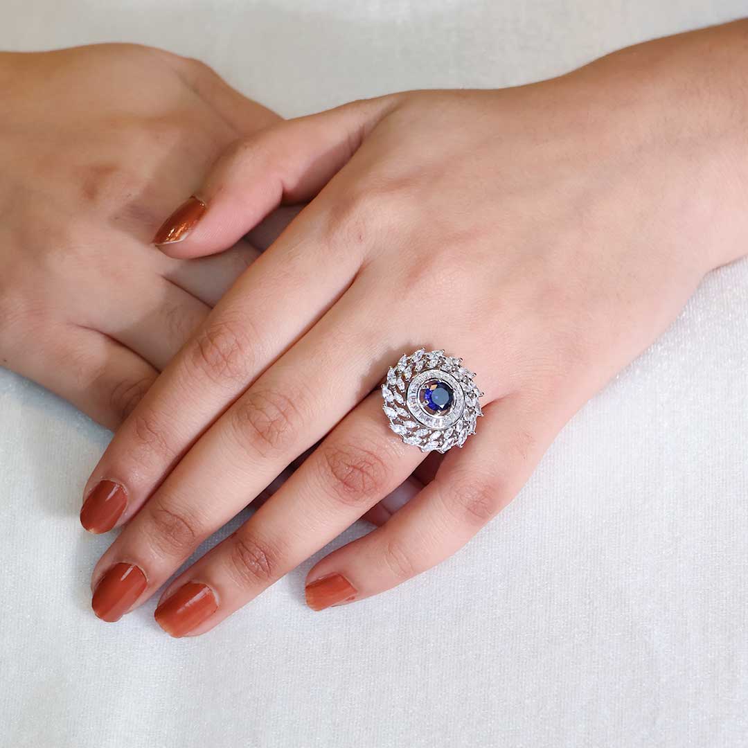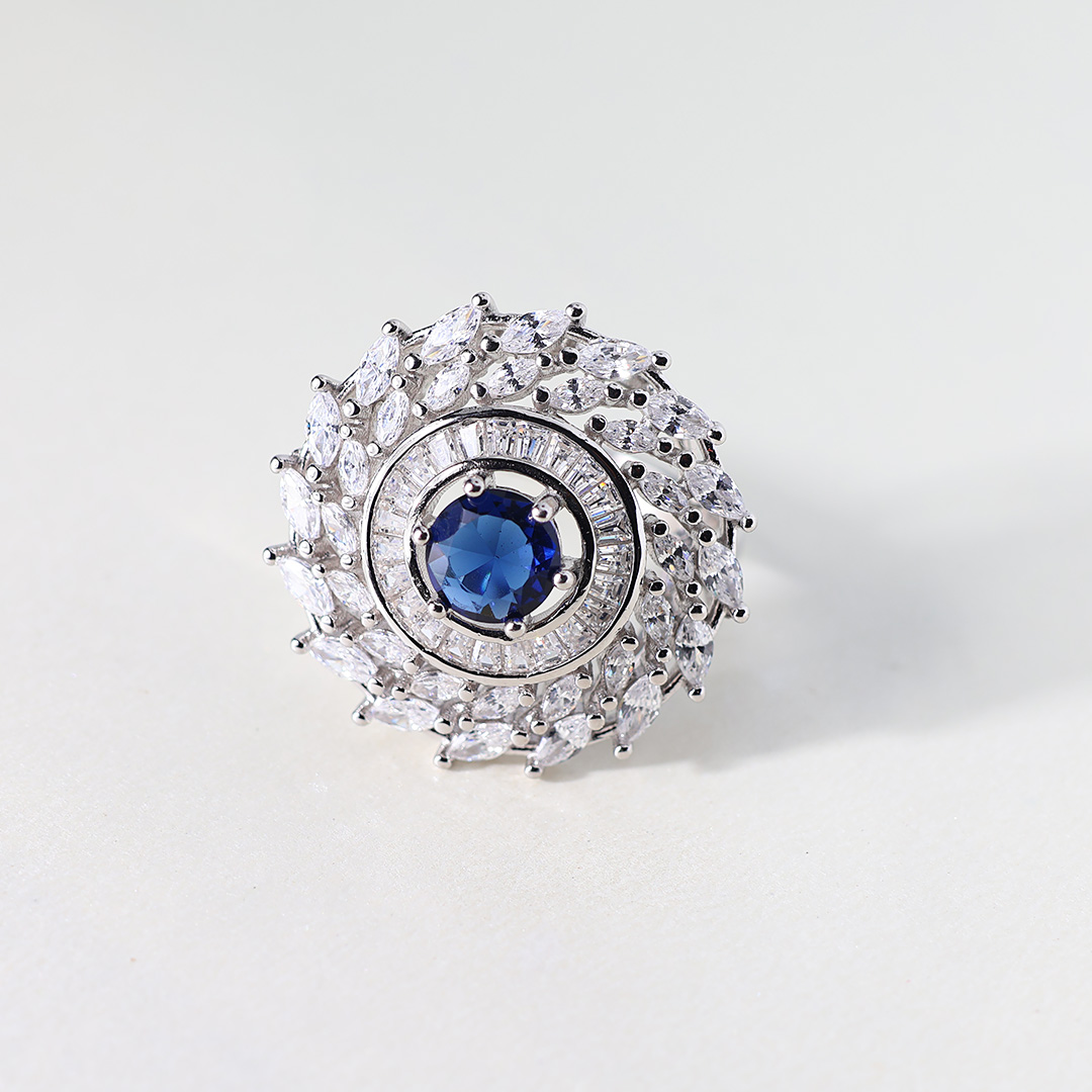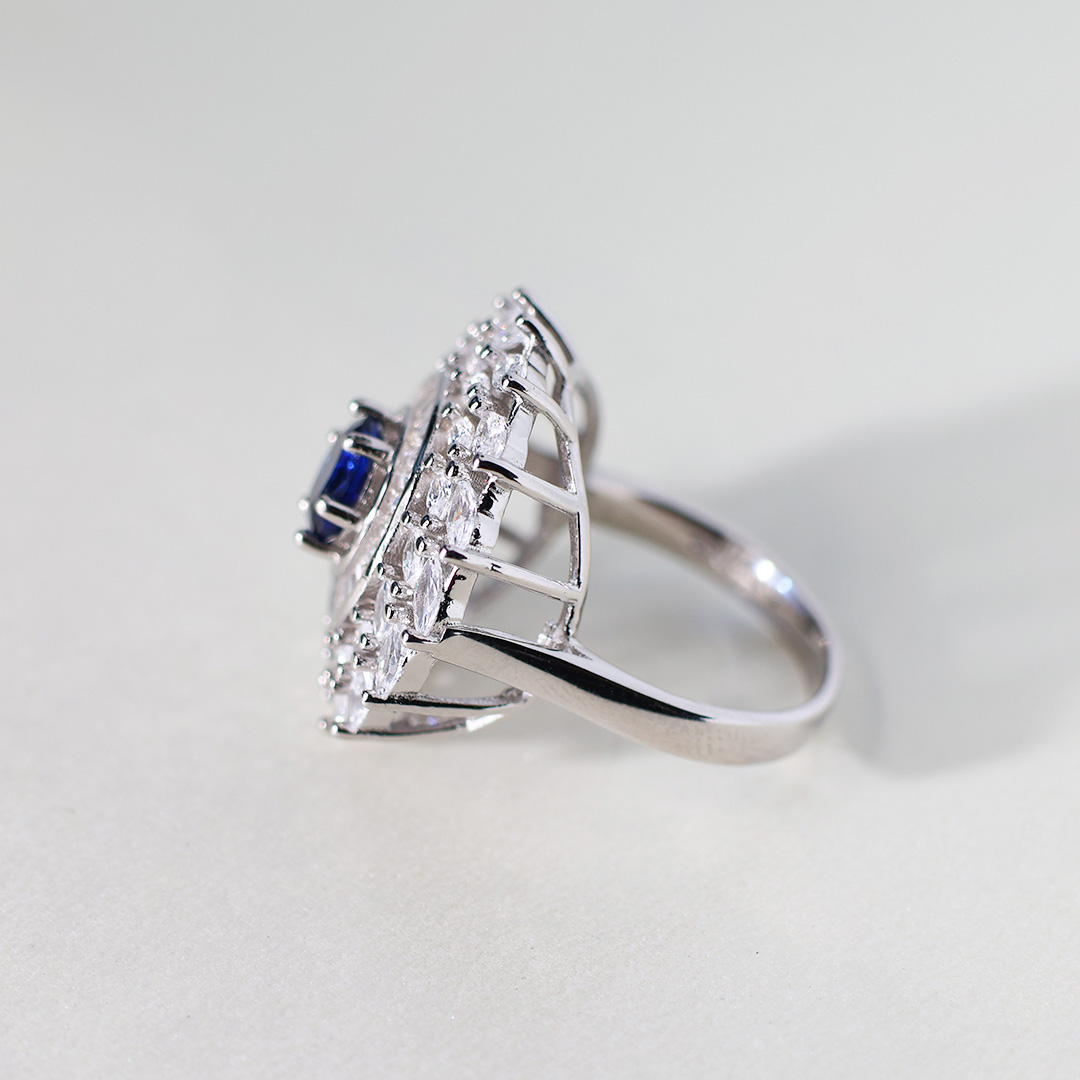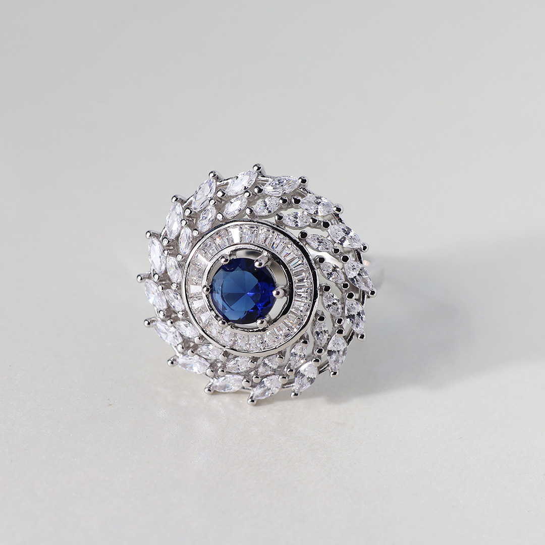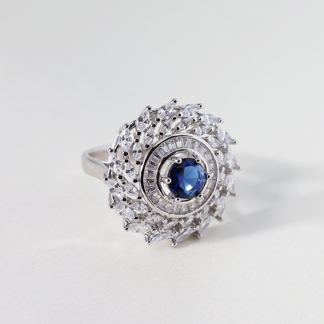 • Radiating Halo of CZs: Surrounding the blue CZ is a halo of smaller, marquise-cut and round brilliant-cut cubic zirconia. This halo creates a starburst or floral effect, adding to the ring’s overall sparkle and visual interest.