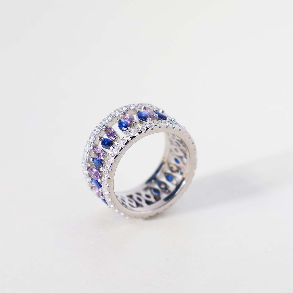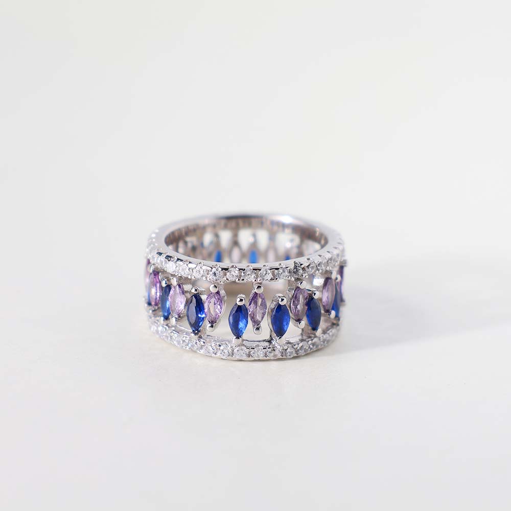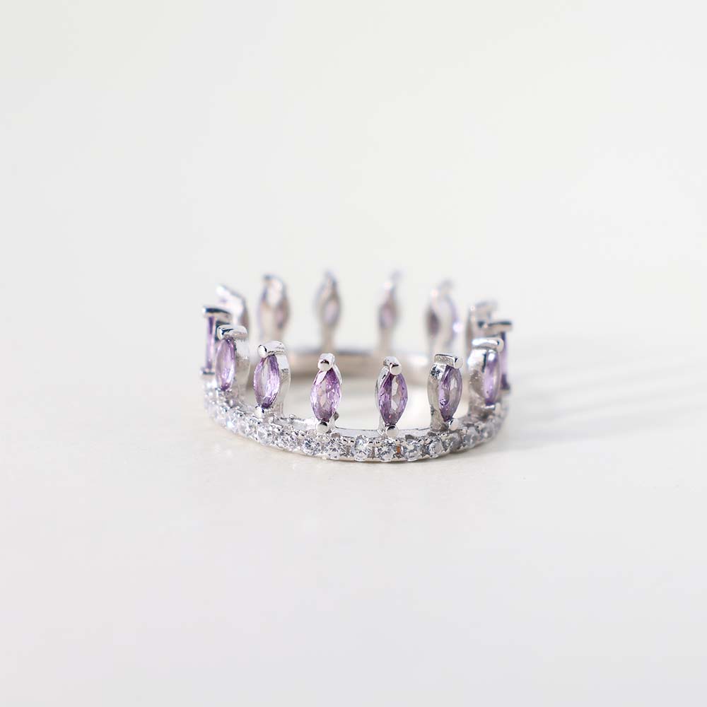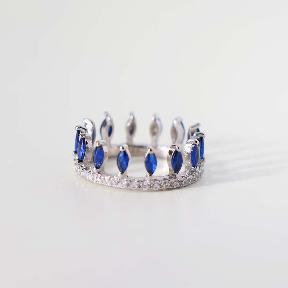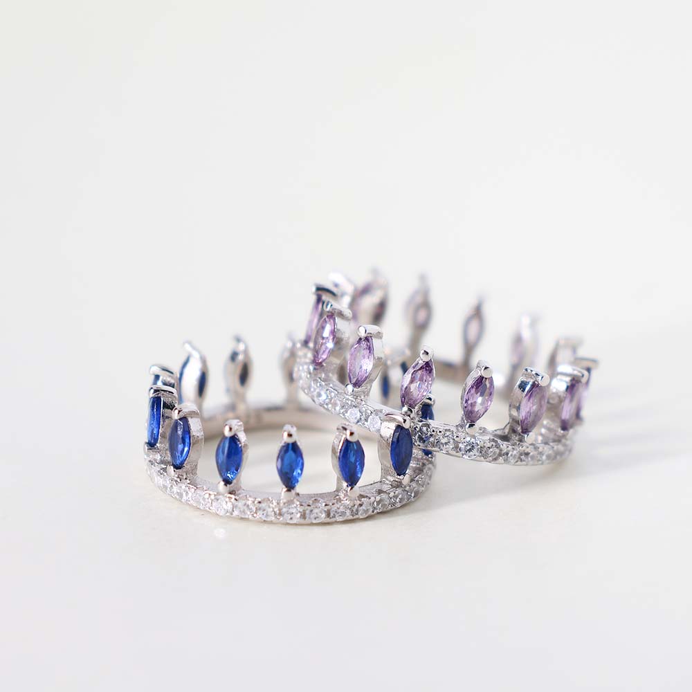 Each ring features a row of marquise-shaped stones, likely colored gemstones, set along the top, mimicking the peaks of a crown. One ring features blue stones, possibly sapphires, and the other features a mix of pink or purple stones, possibly sapphires or amethysts.
