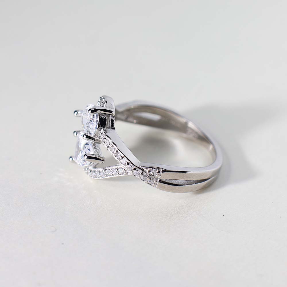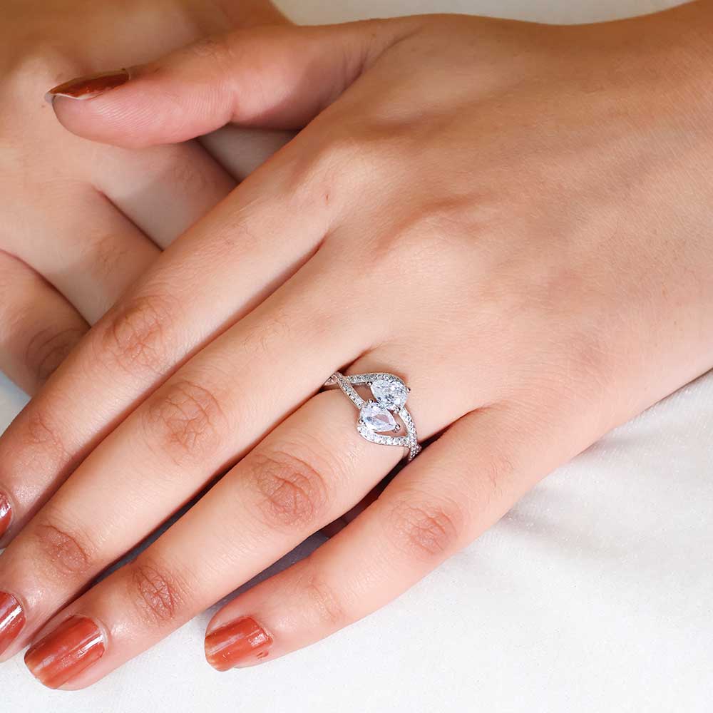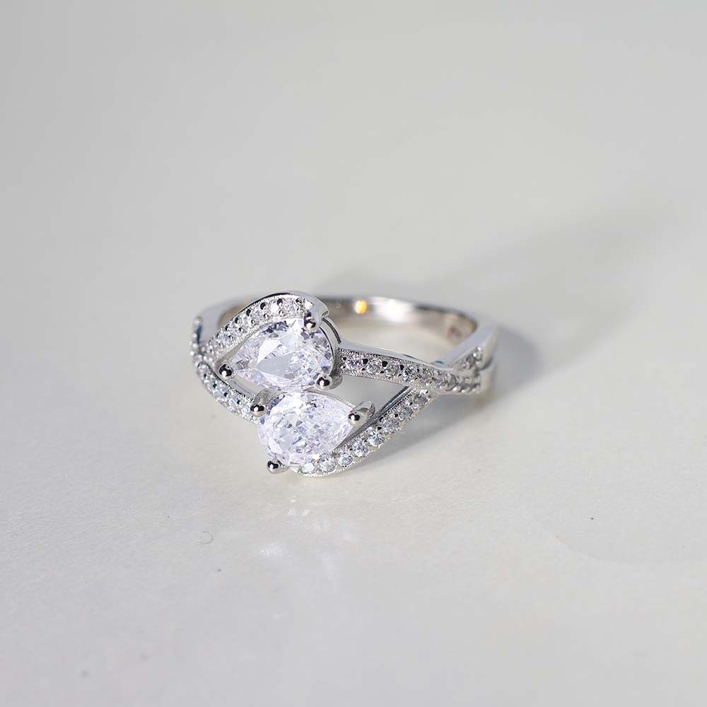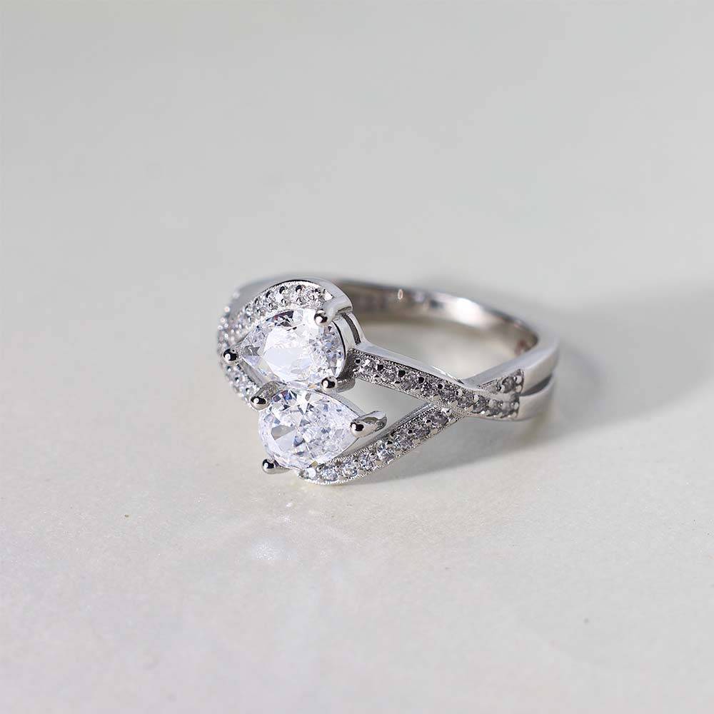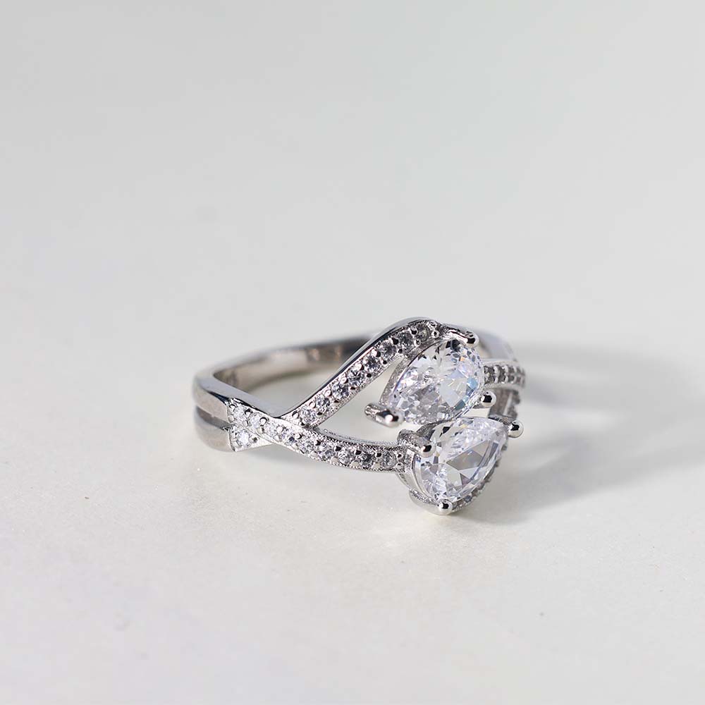 The ring features two prominent pear-shaped diamonds (or diamond simulants), creating a unique and eye-catching focal point.