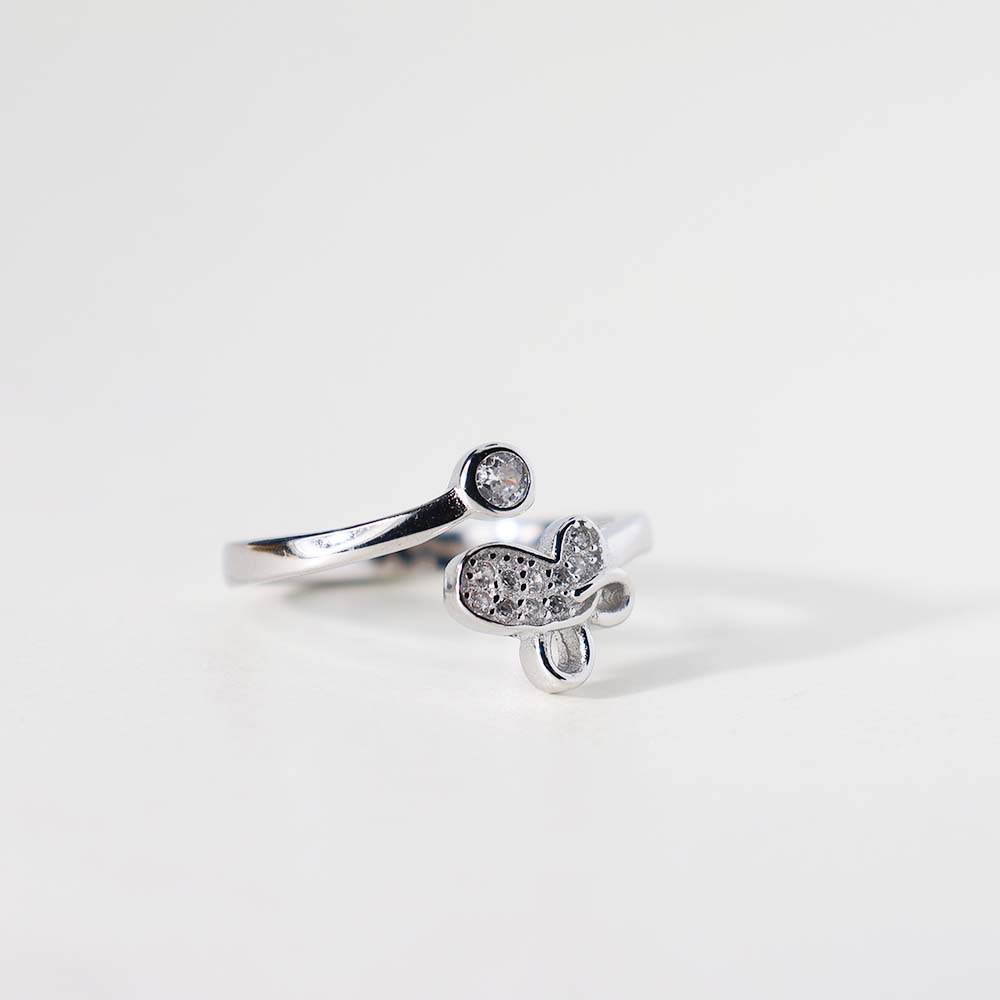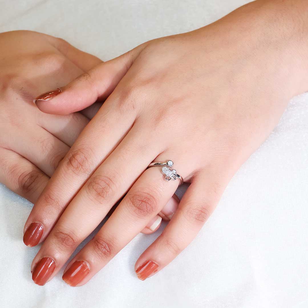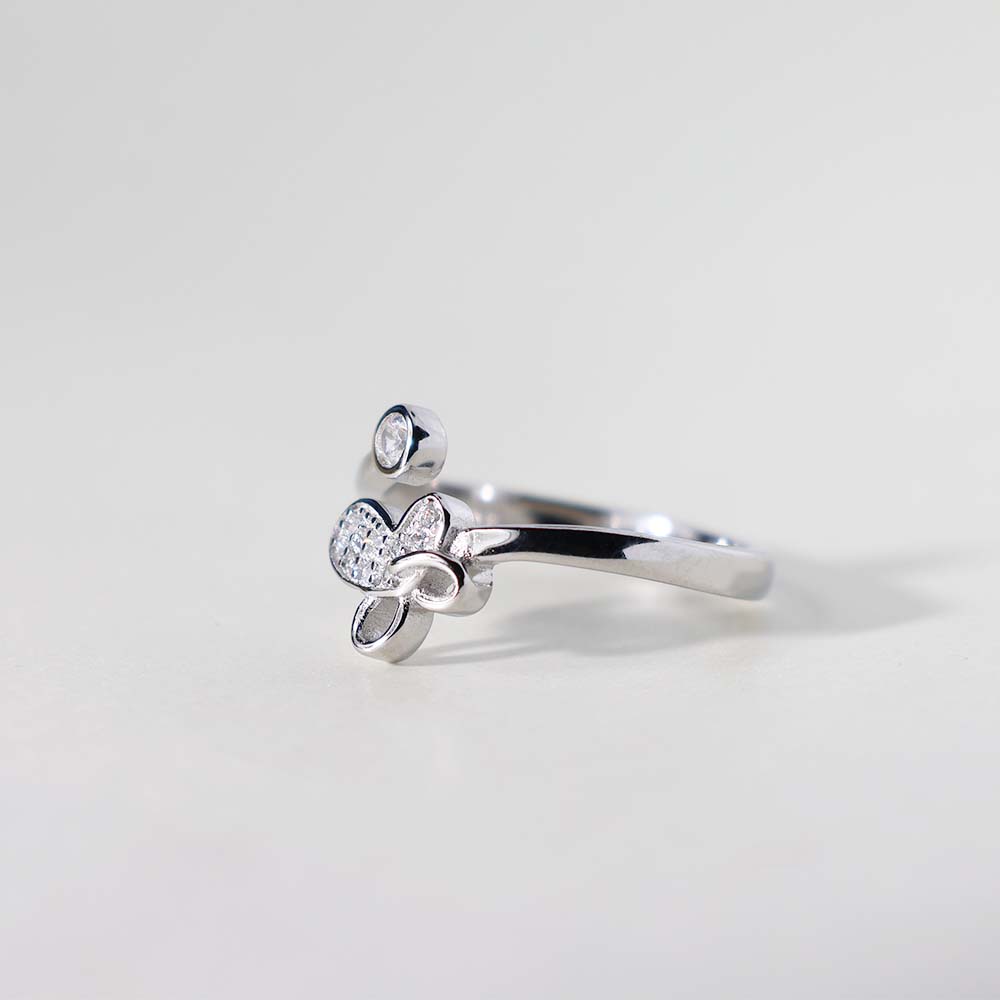The ring is likely crafted from a white metal, such as sterling silver, which complements the delicate design and sparkling stones.