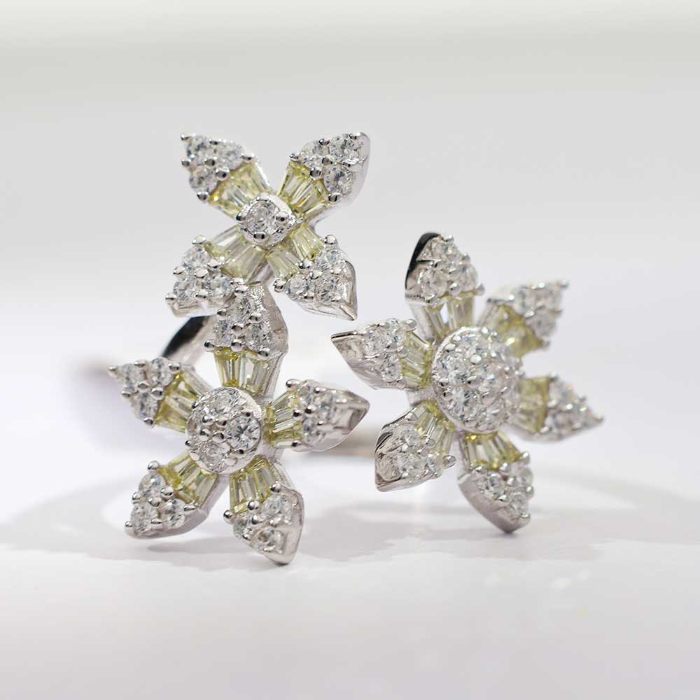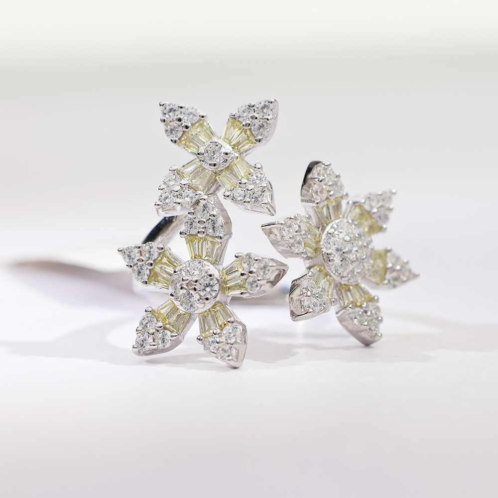 Multiple crystal petals fan out in a frosted floral cluster over a sleek 925 silver base — modern, sophisticated, and made to shine.-