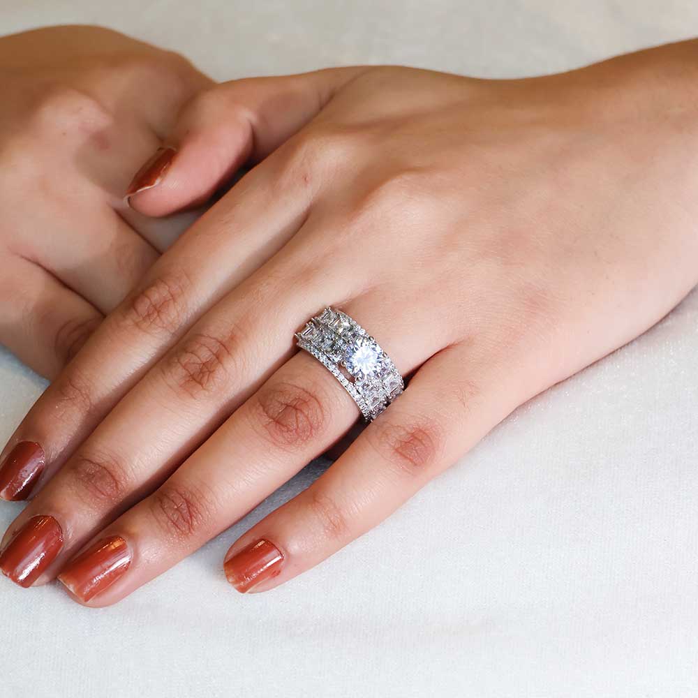 Asymmetrical Balance: While the layered design is concentrated on one side, the overall look is balanced by the presence of the larger center stone on the opposite side. This creates a visually interesting asymmetry.