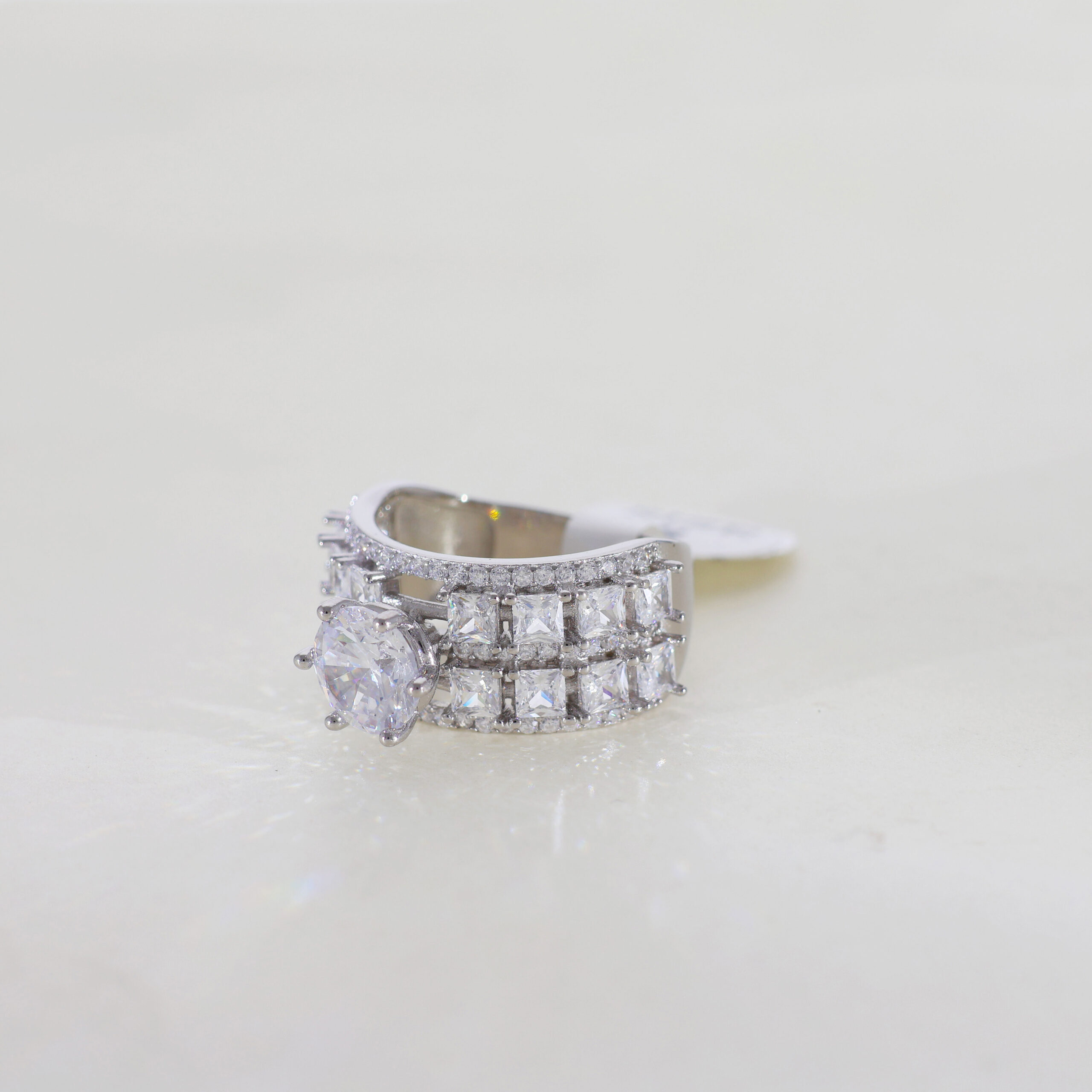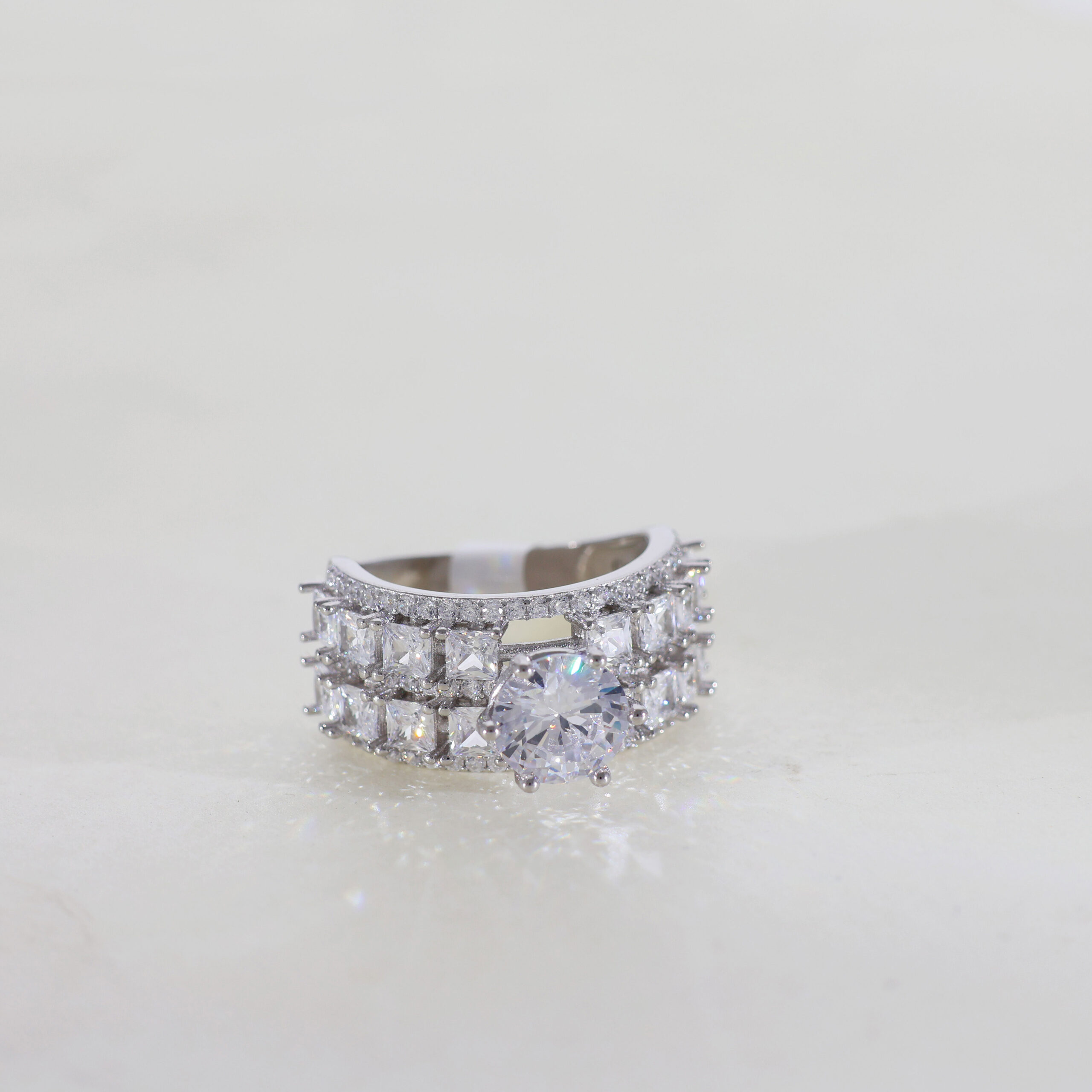 White Metal Setting: The ring is likely set in white gold or platinum, which provides a bright, neutral backdrop that accentuates the sparkle of the stones. The metal’s luster complements the icy brilliance of the overall design.