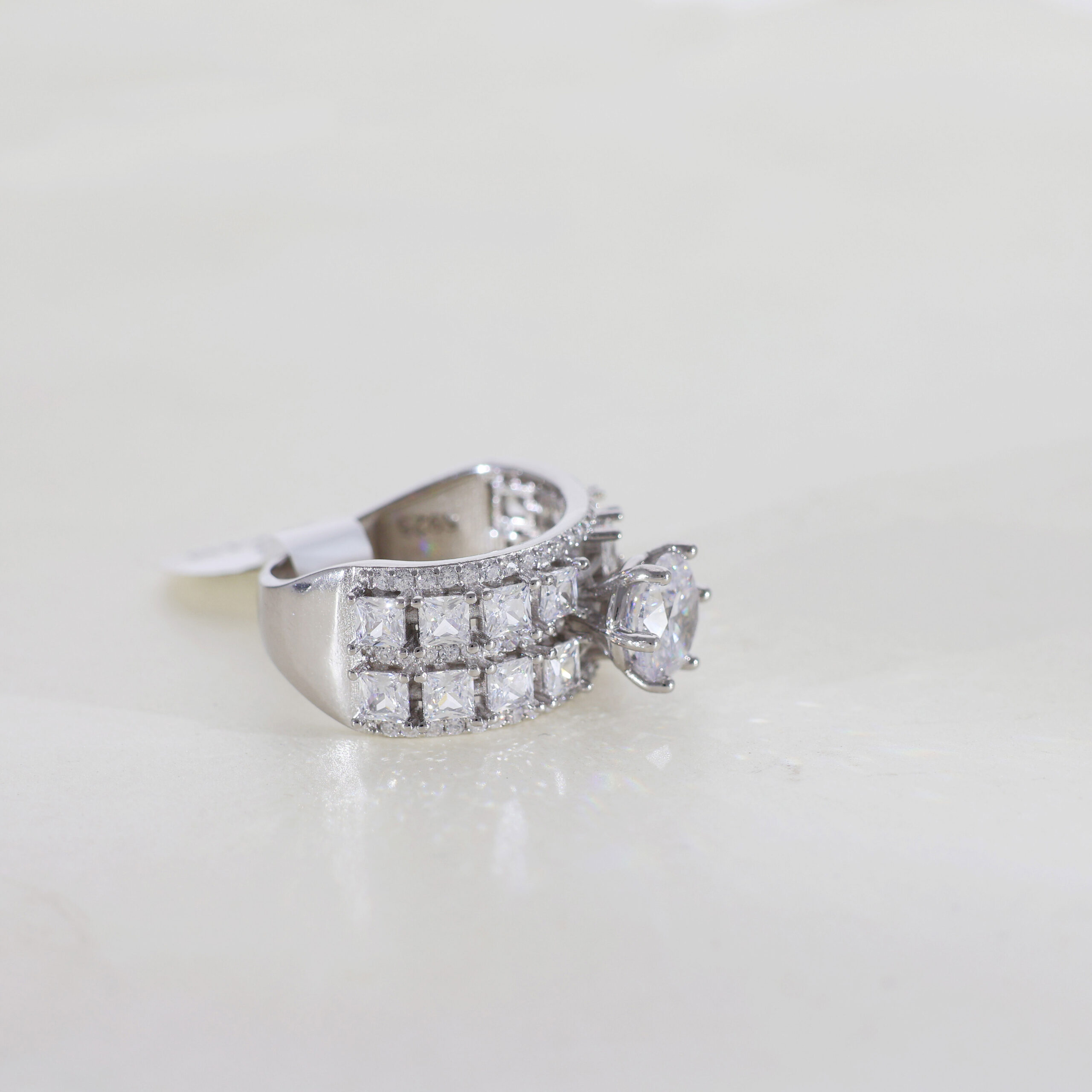 Stepped, Geometric Layers: The most distinctive feature is the stepped, layered design of the band. Multiple rows of smaller, square or princess-cut stones are channel set, creating a gradual cascade of sparkle down one side of the band.