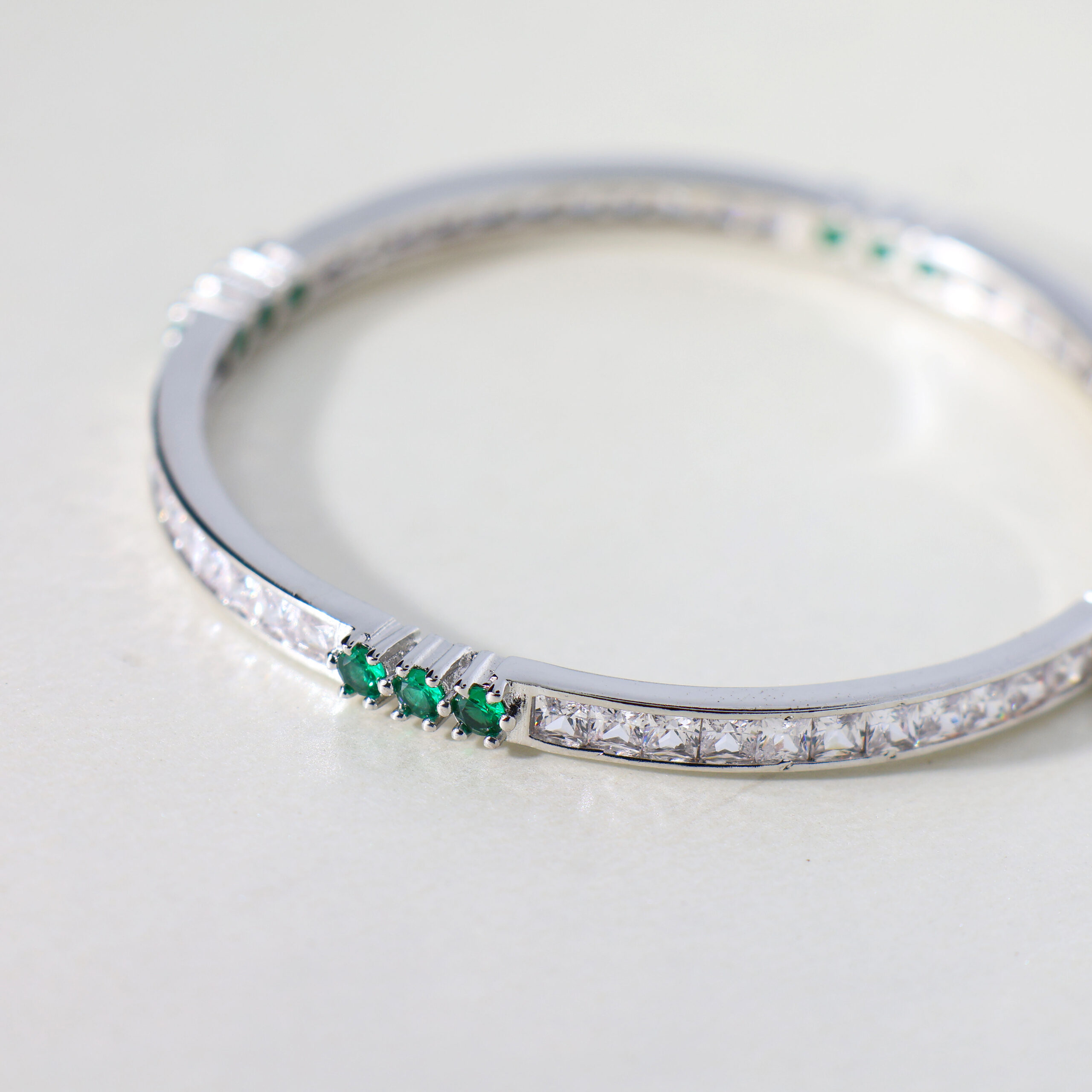 Crafted in silver with alternating green and clear stones, this design is made to bring out your baby’s natural shine.