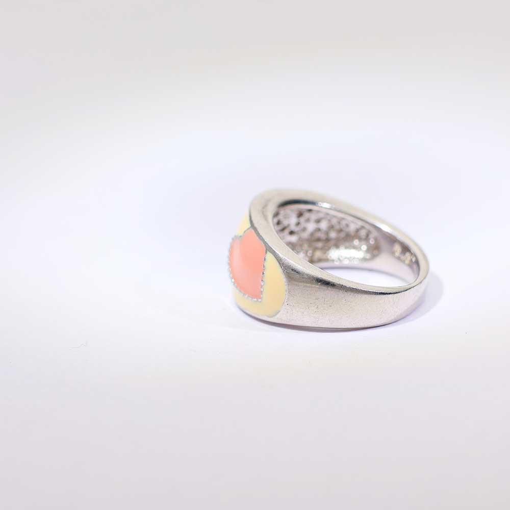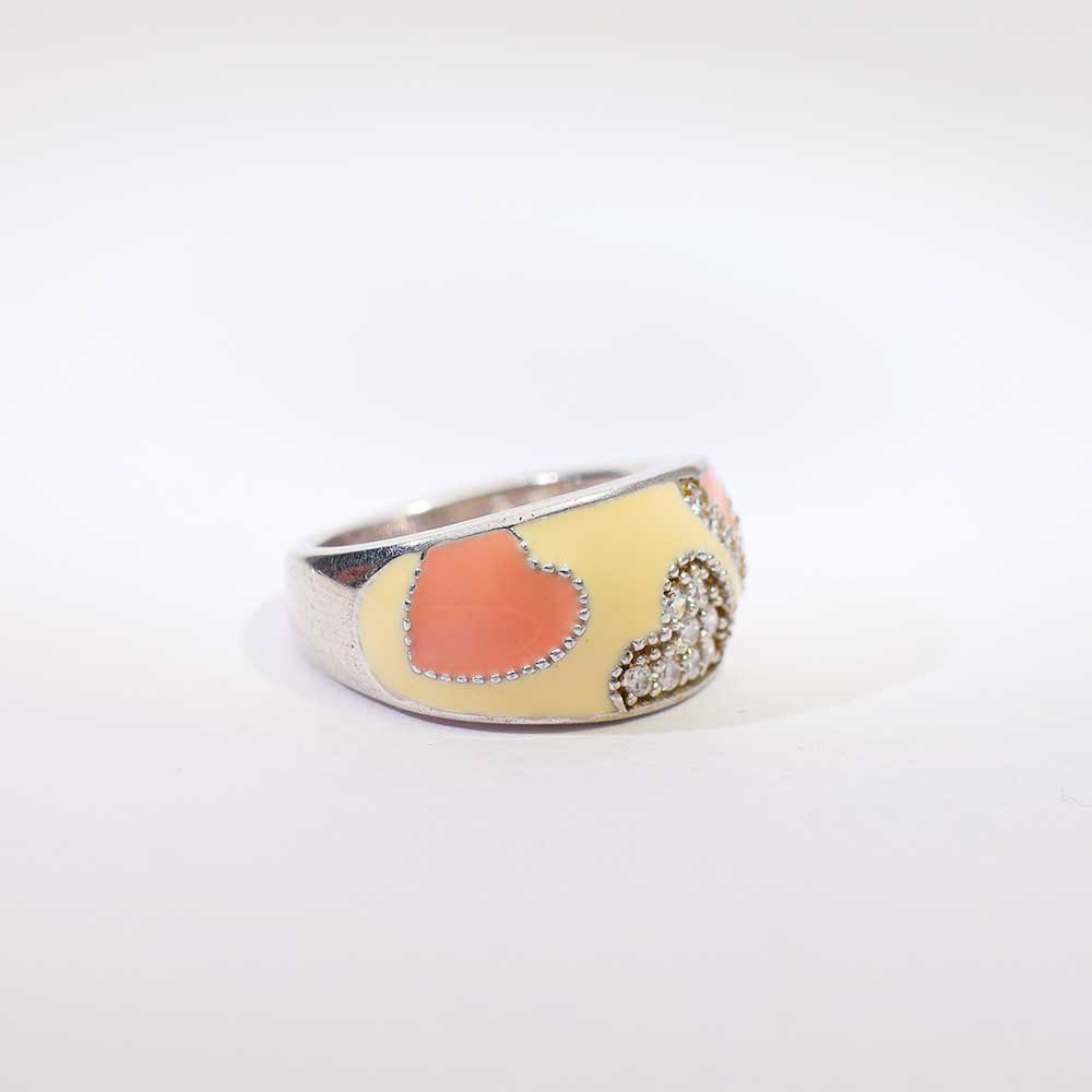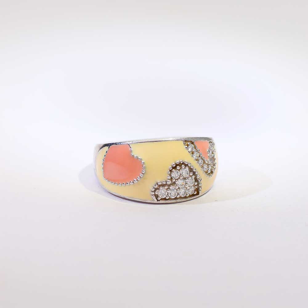 Cream enamel painted with sparkly silver hearts and a blush of pink. Set on a polished silver band made to last and love.-