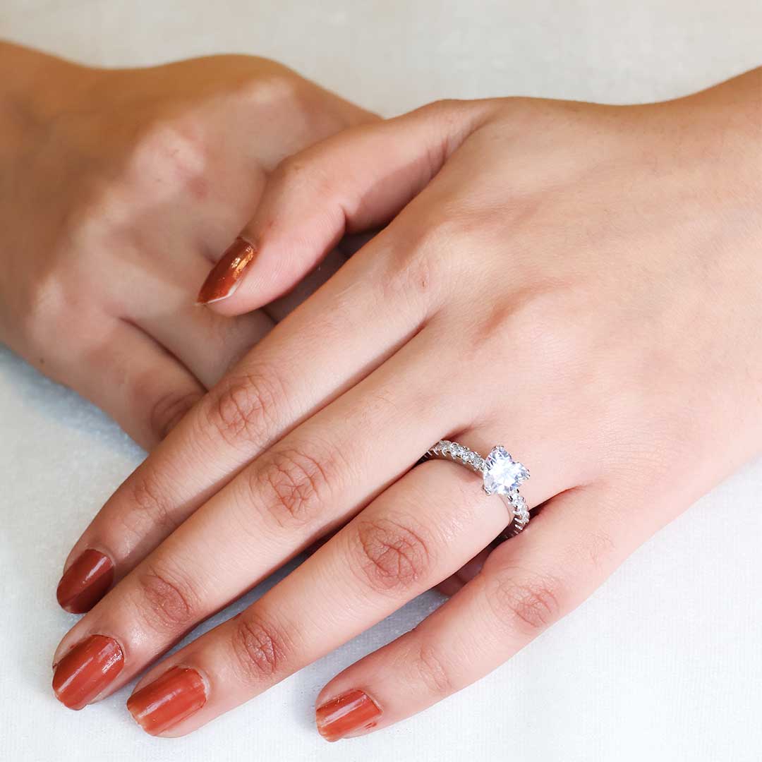 The band of the ring is embellished with a row of smaller, round stones, creating a sparkling effect and complementing the central stone.