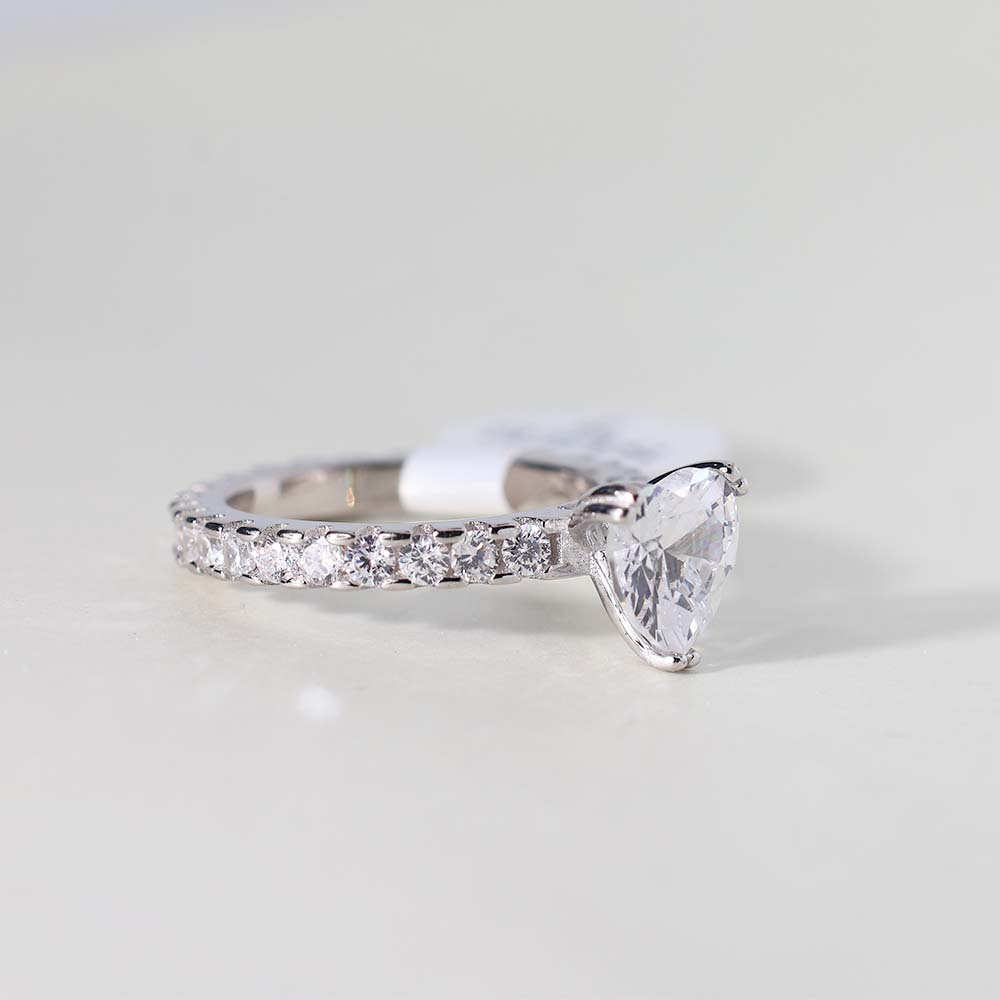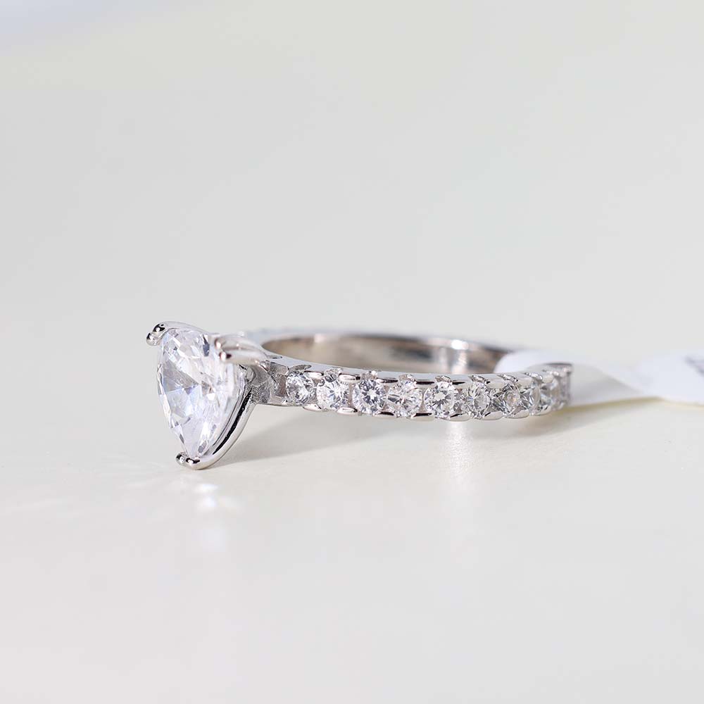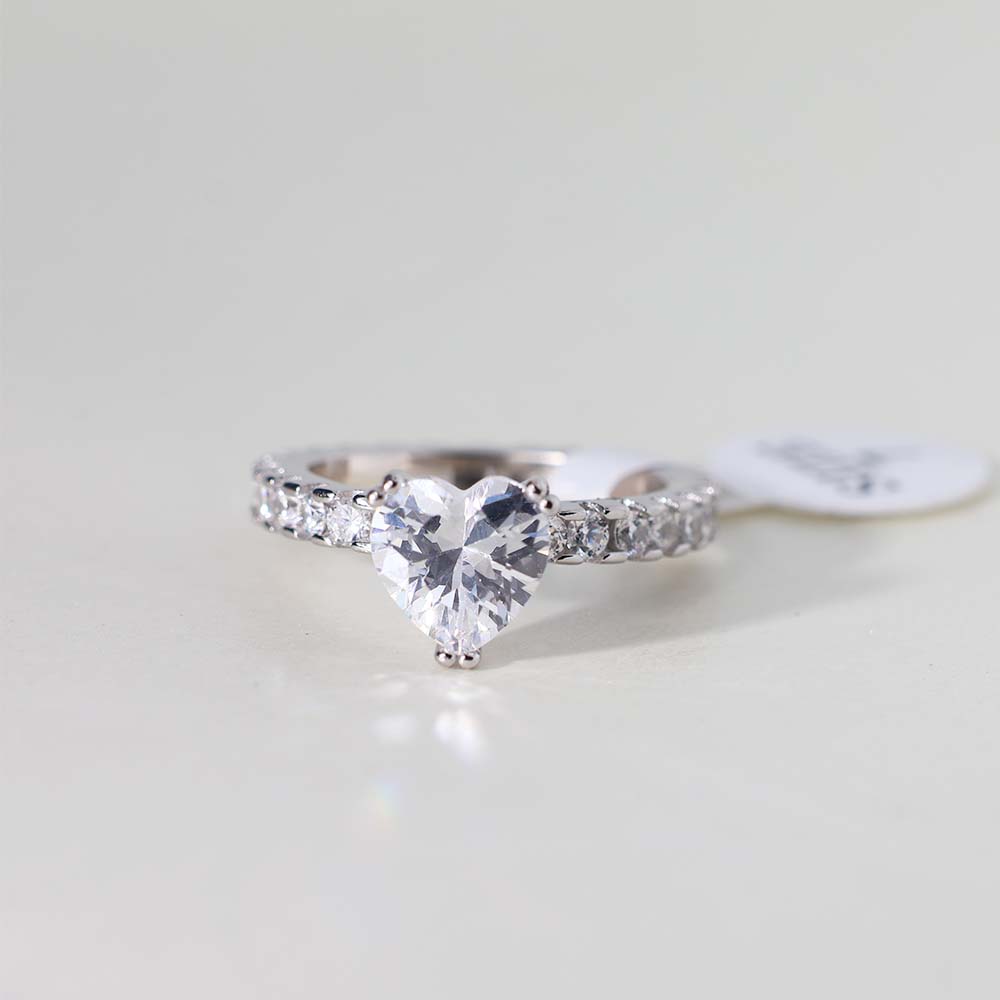 The ring features a heart-shaped clear stone, likely a cubic zirconia, white topaz, or diamond simulant, as its central stone.