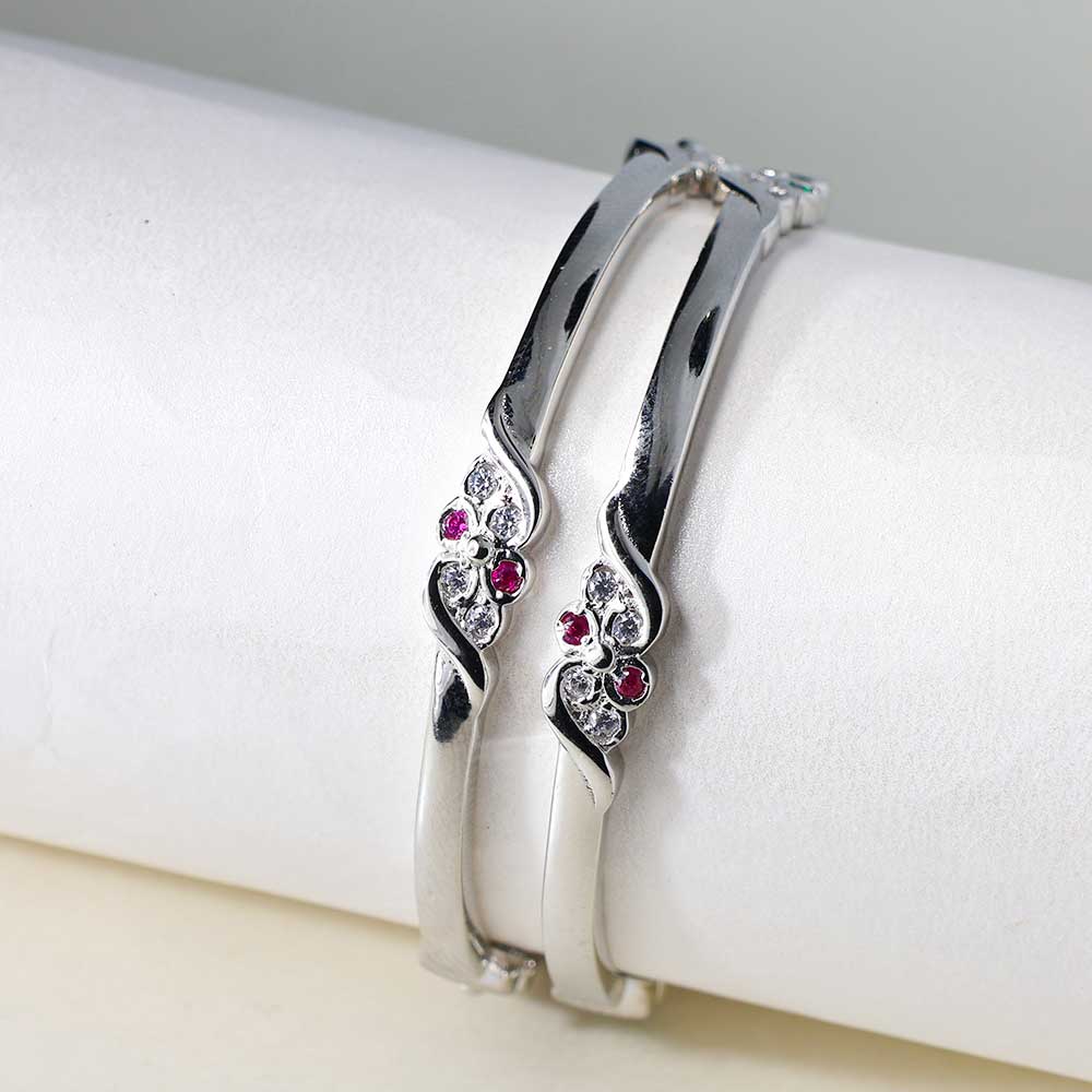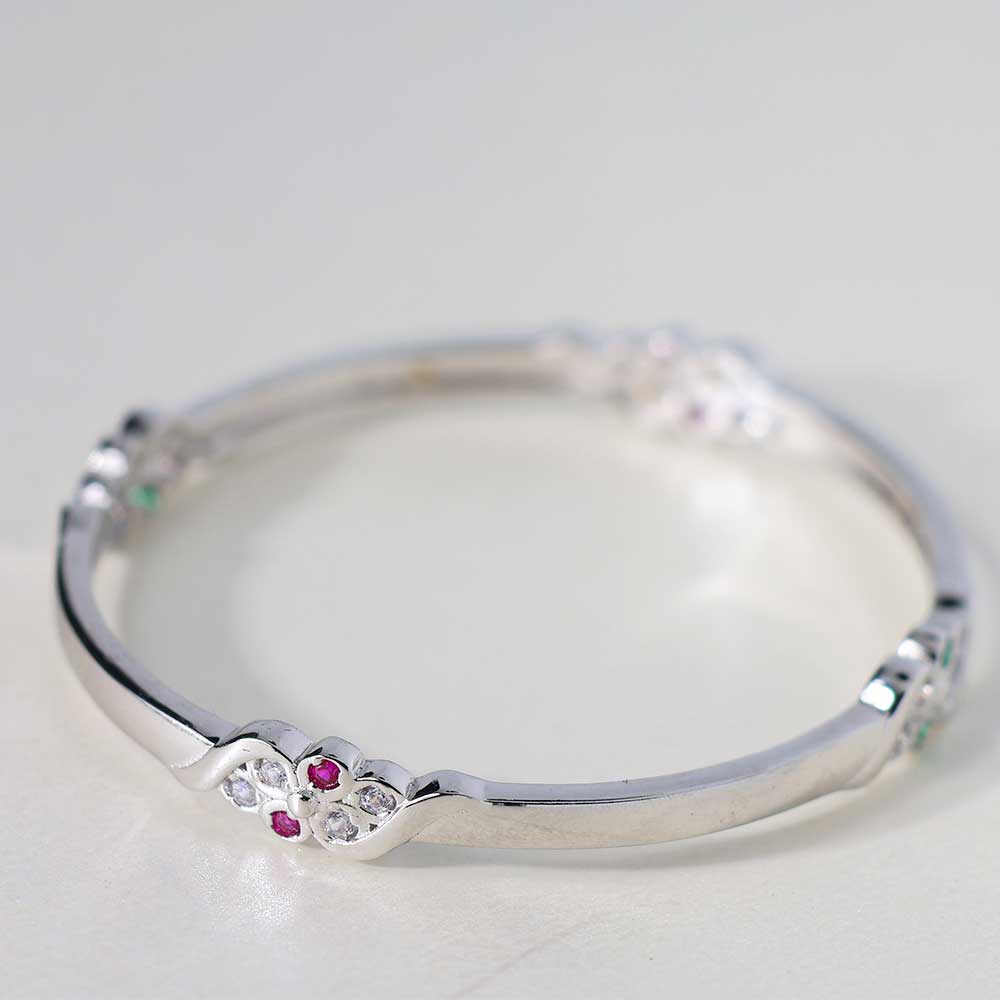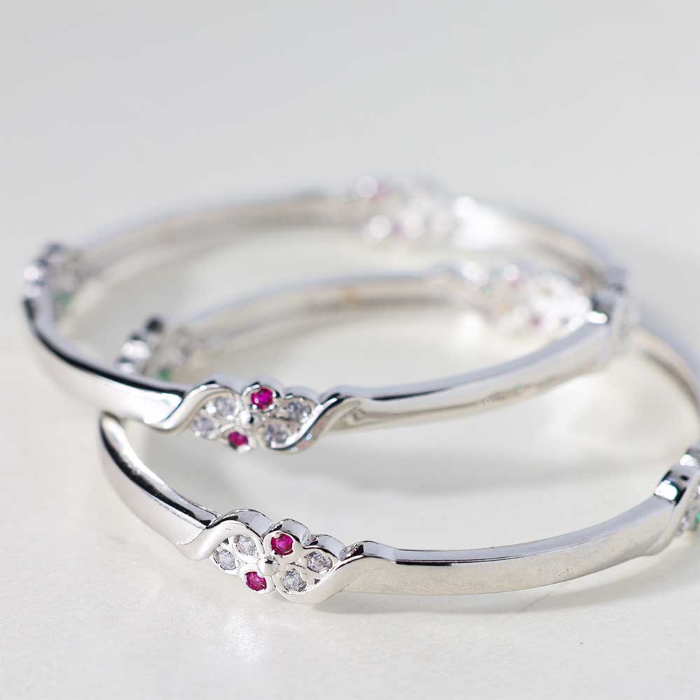 A clean silver band with pretty pink flowers and a touch of sparkle, these are made to grow with your little one.