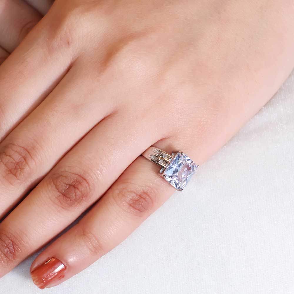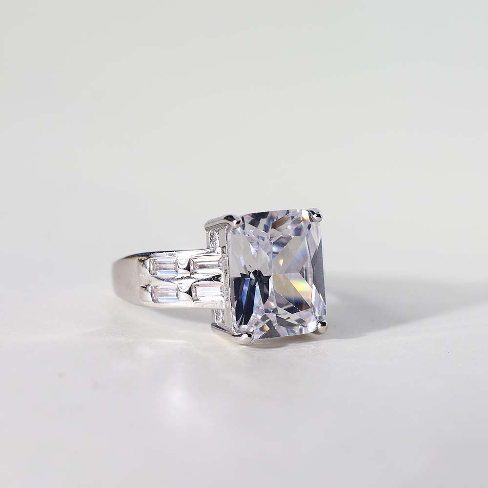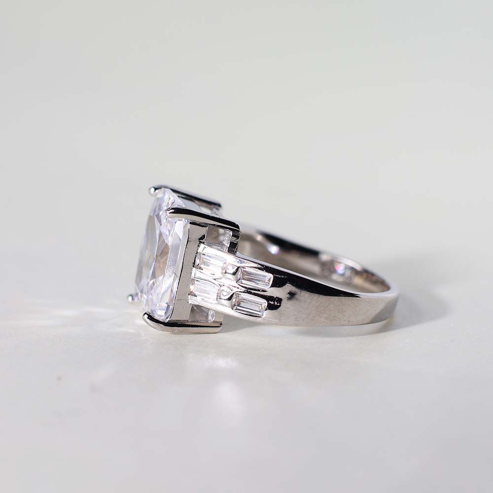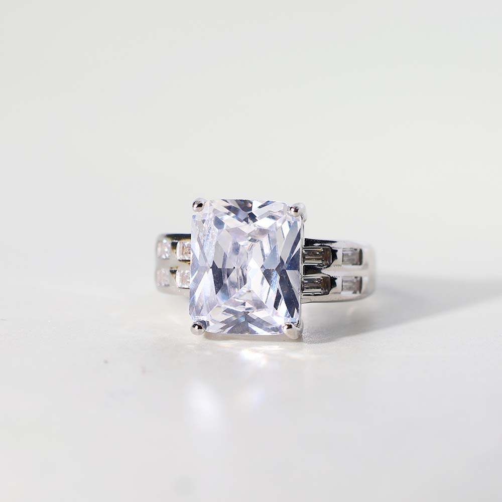 The ring features a large, emerald-cut clear stone, likely a cubic zirconia, white sapphire, or possibly a diamond simulant, as its dazzling centerpiece.