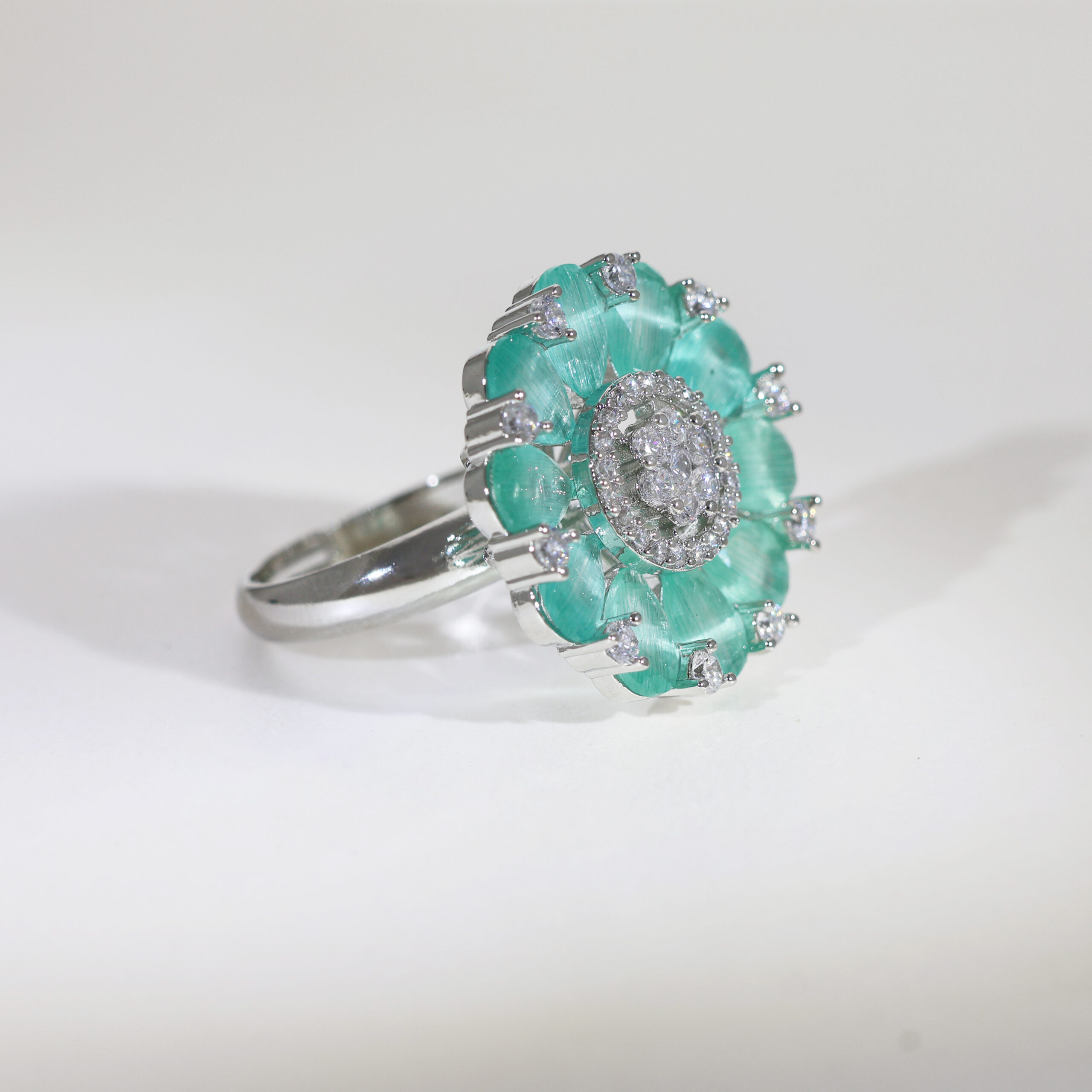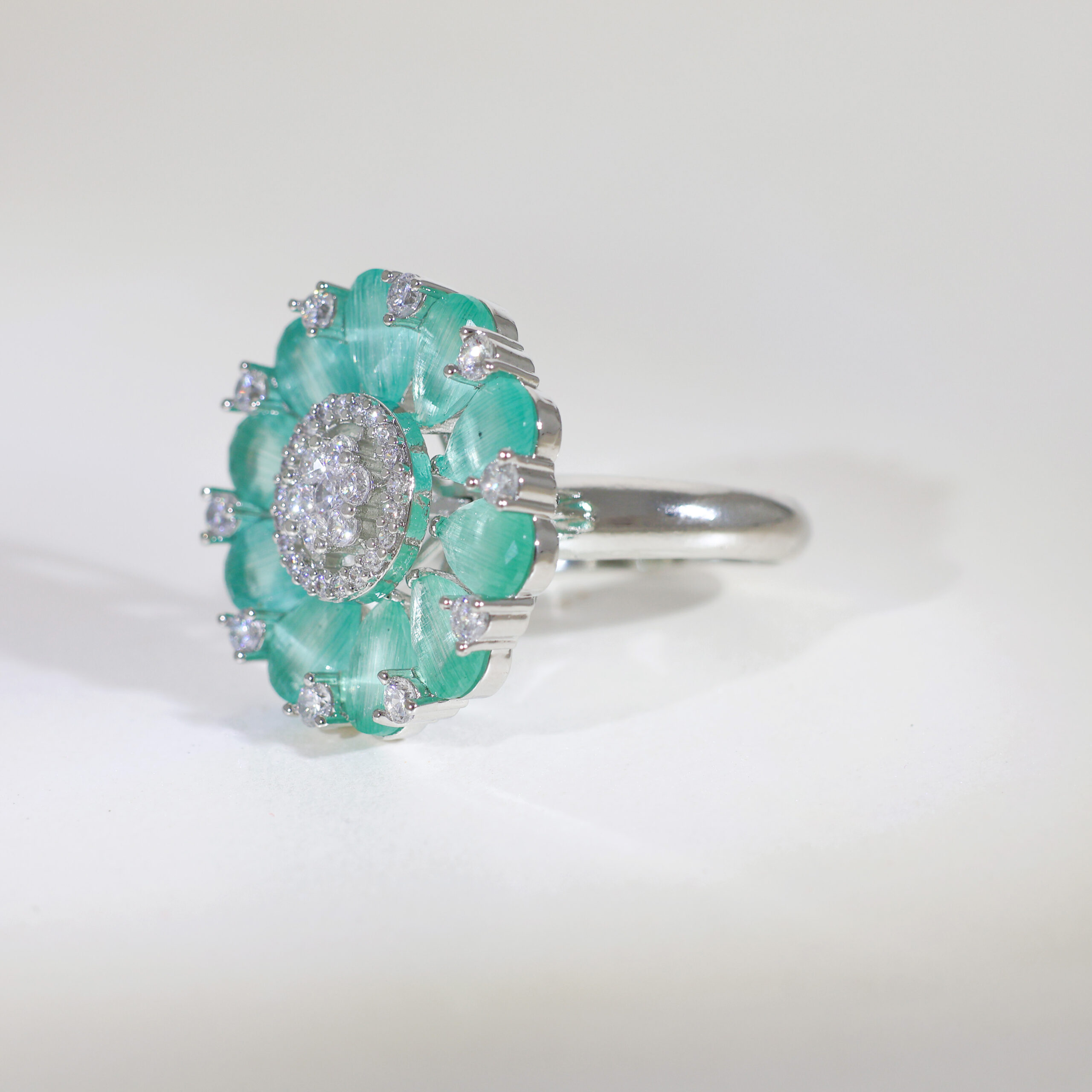 A stunning flower with soft mint green petals surrounds a dazzling central stone cluster, all set in polished 925 silver. This is a bold, feminine ring that blossoms with style.Highlights: