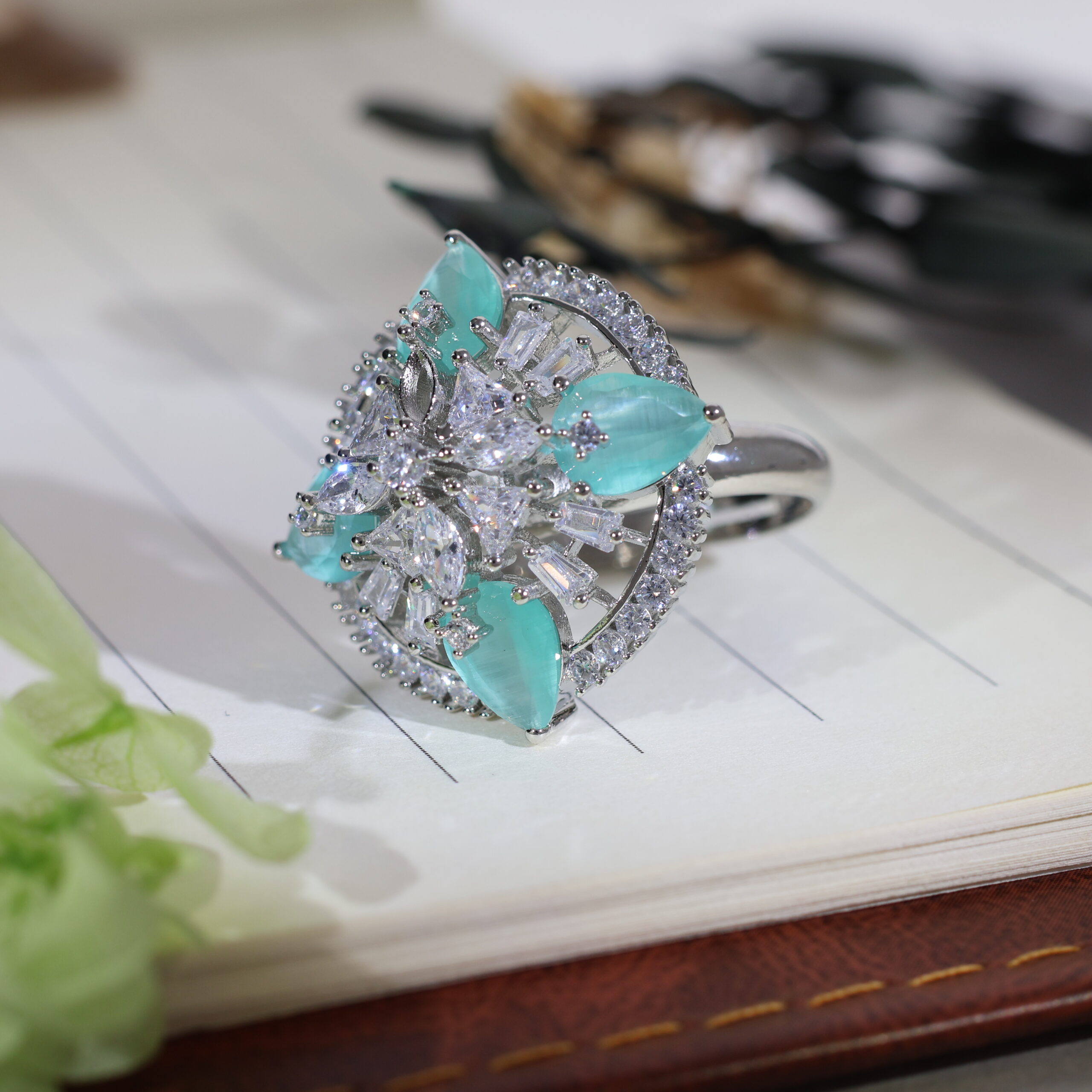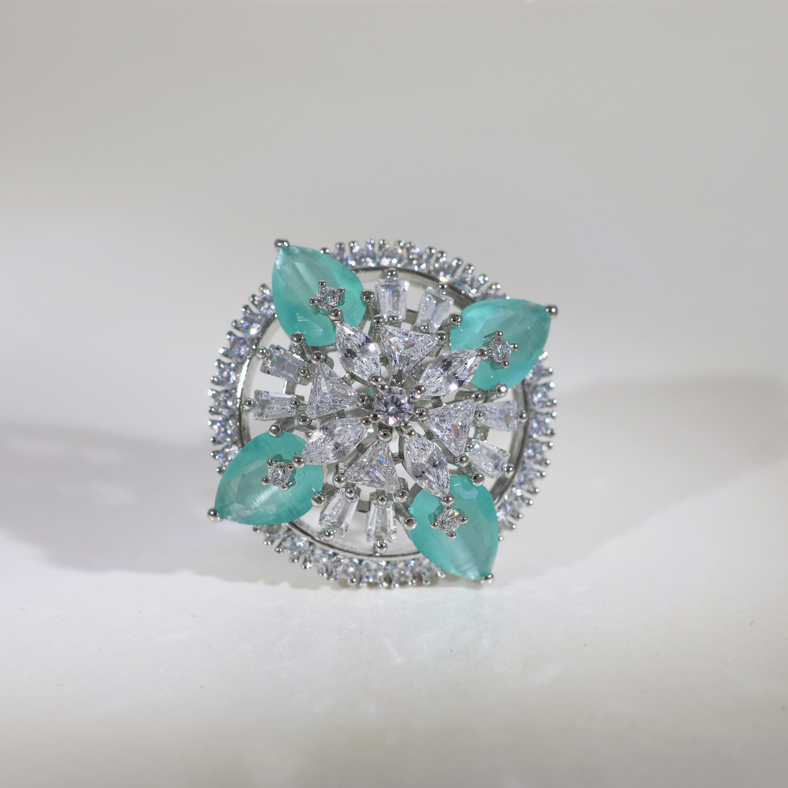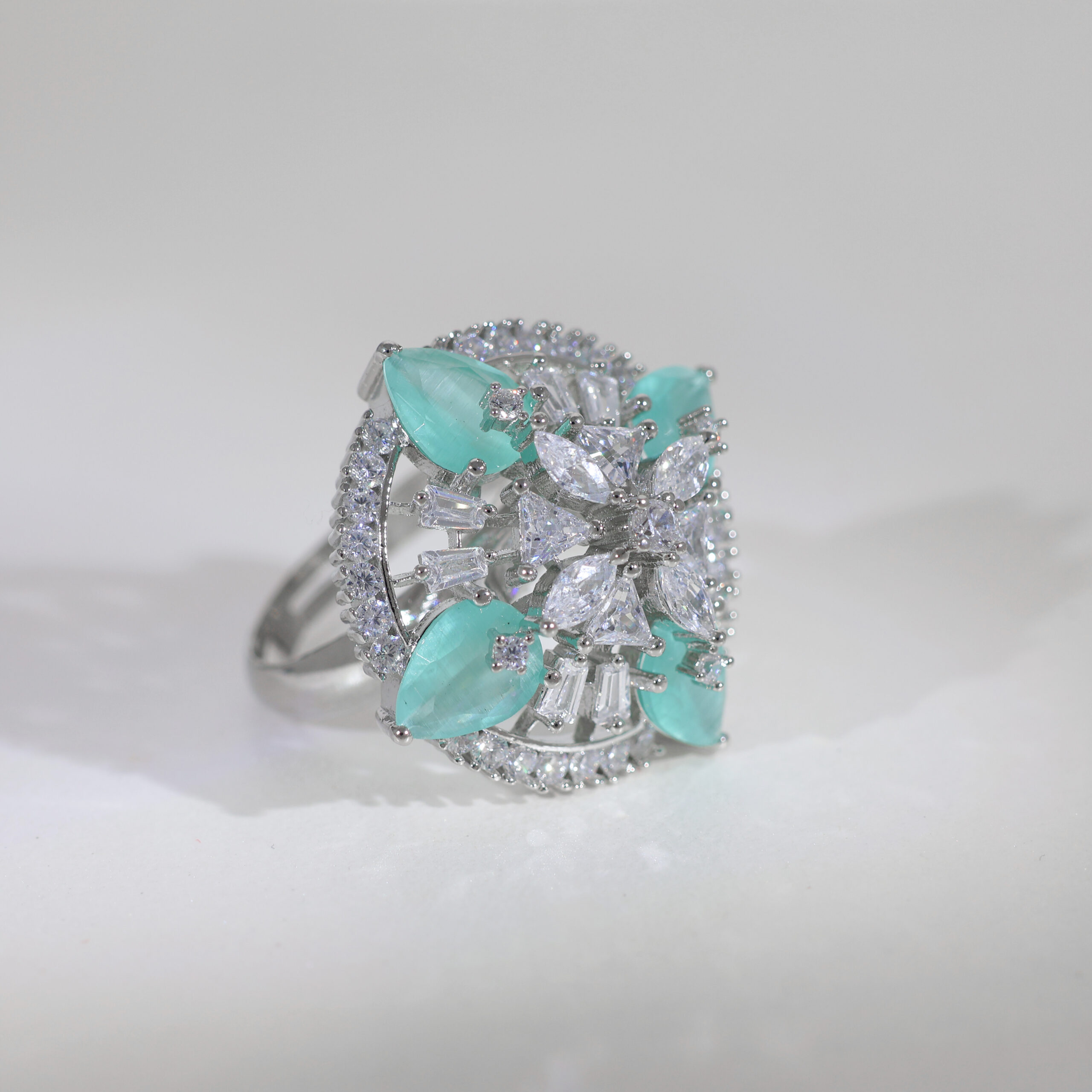 Celebrate moments that matter with a regal splash of mint green. The Mint Royalty Cocktail Ring is a standout in your 925 silver jewellery by Zvar collection.The Design:
