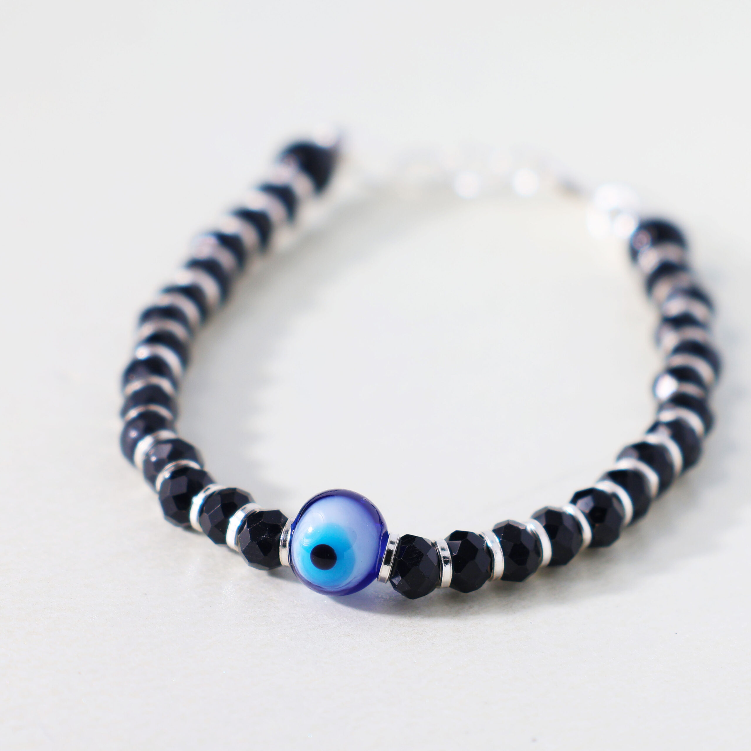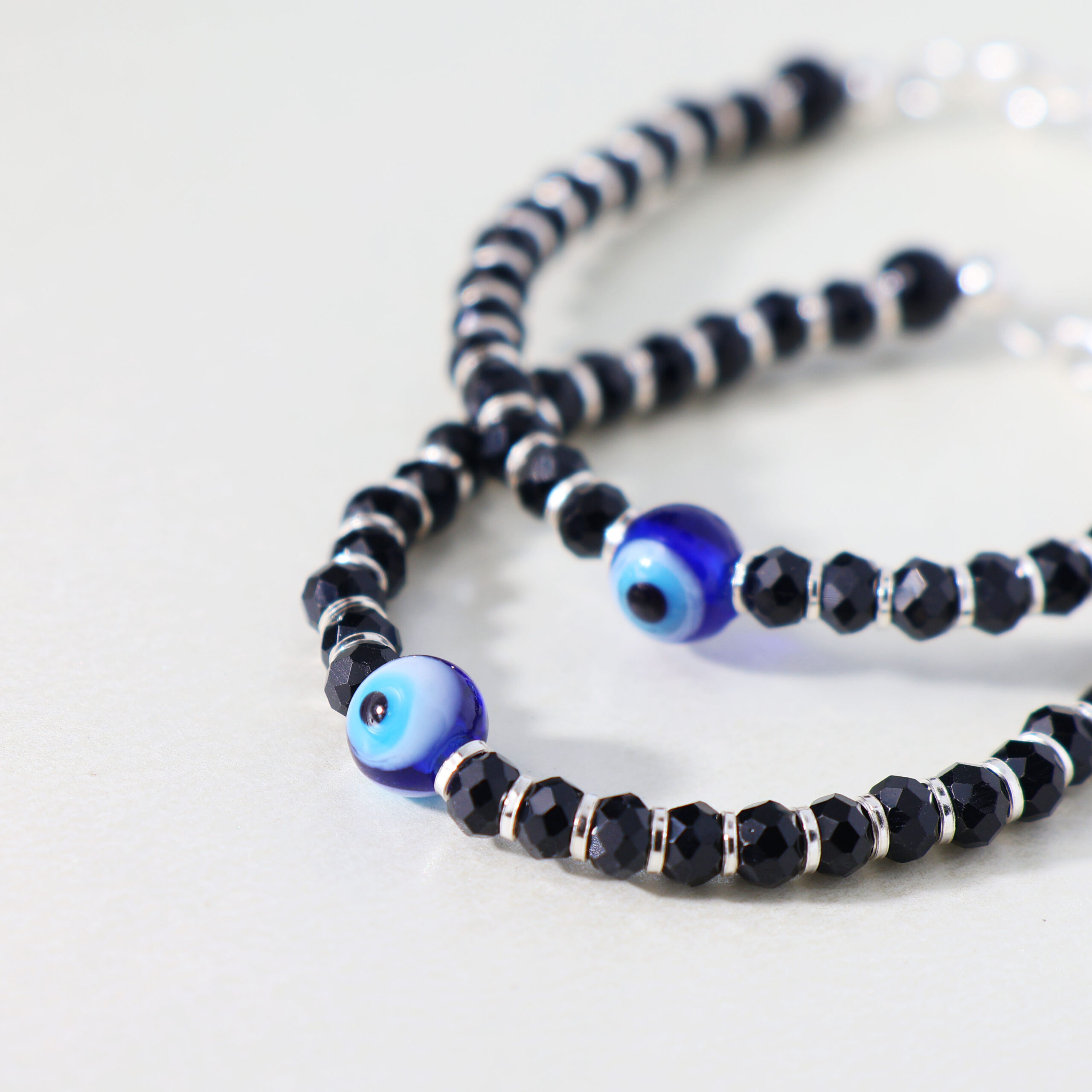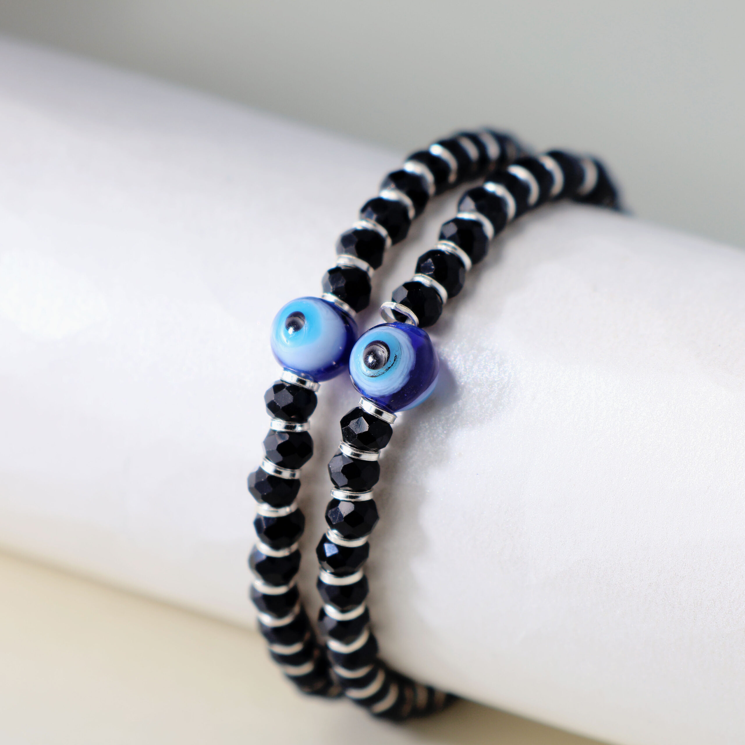 Design: A vibrant blend of black crystals and silver-toned shine centered with the classic evil eye talisman.