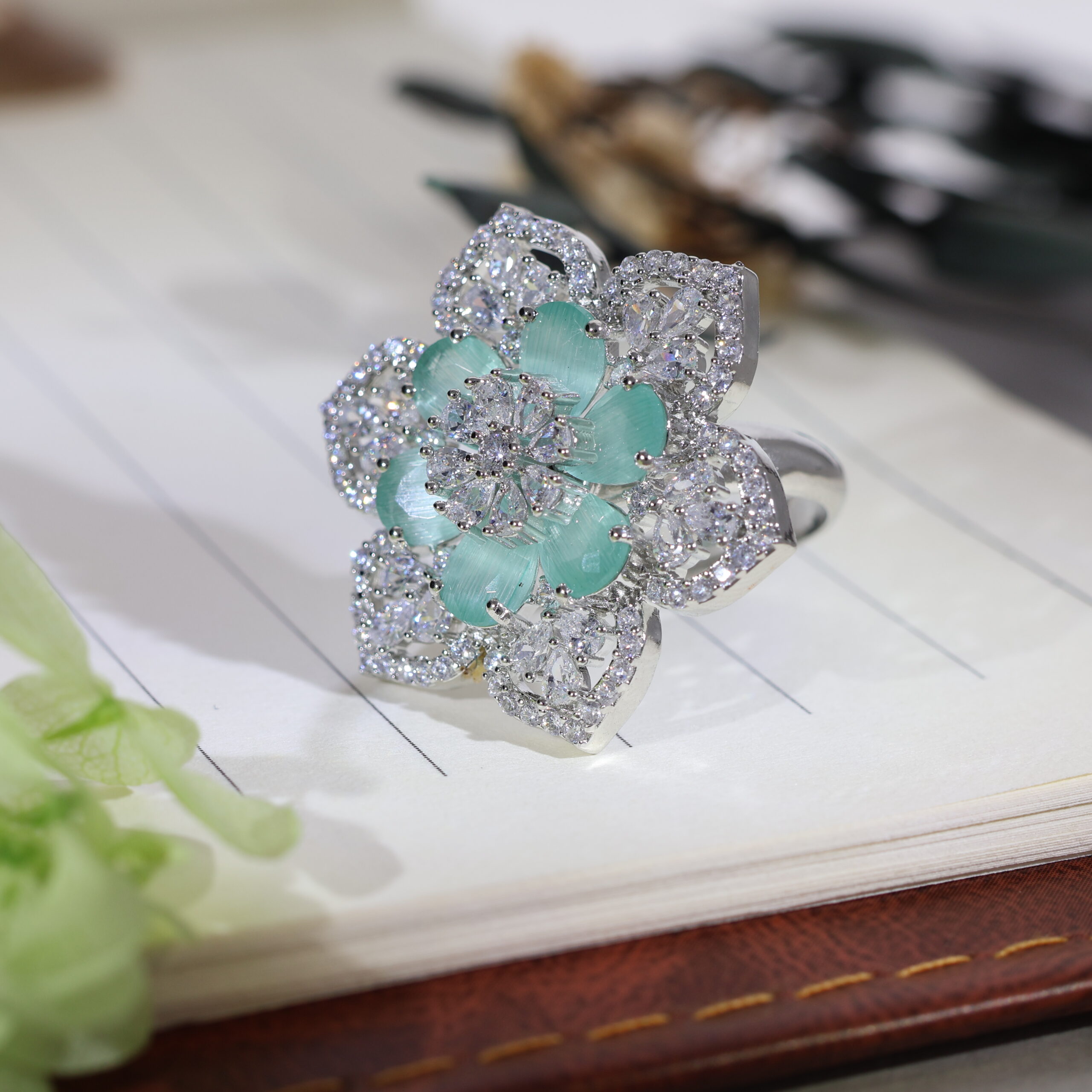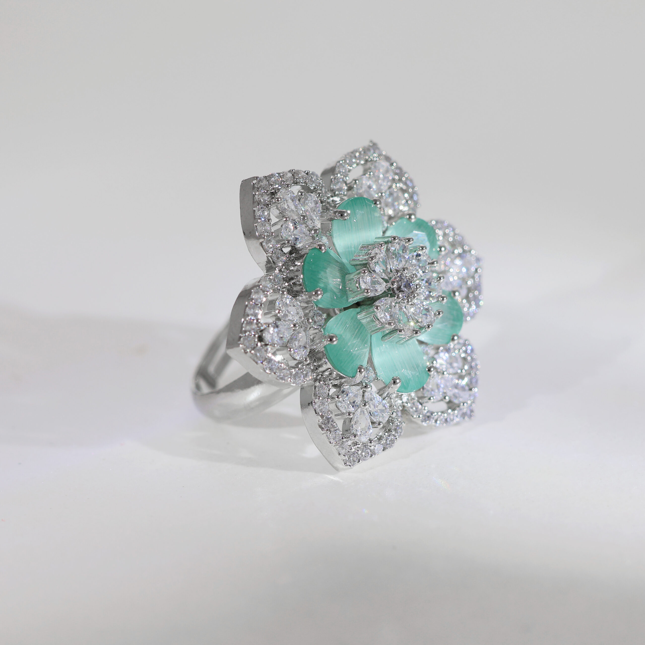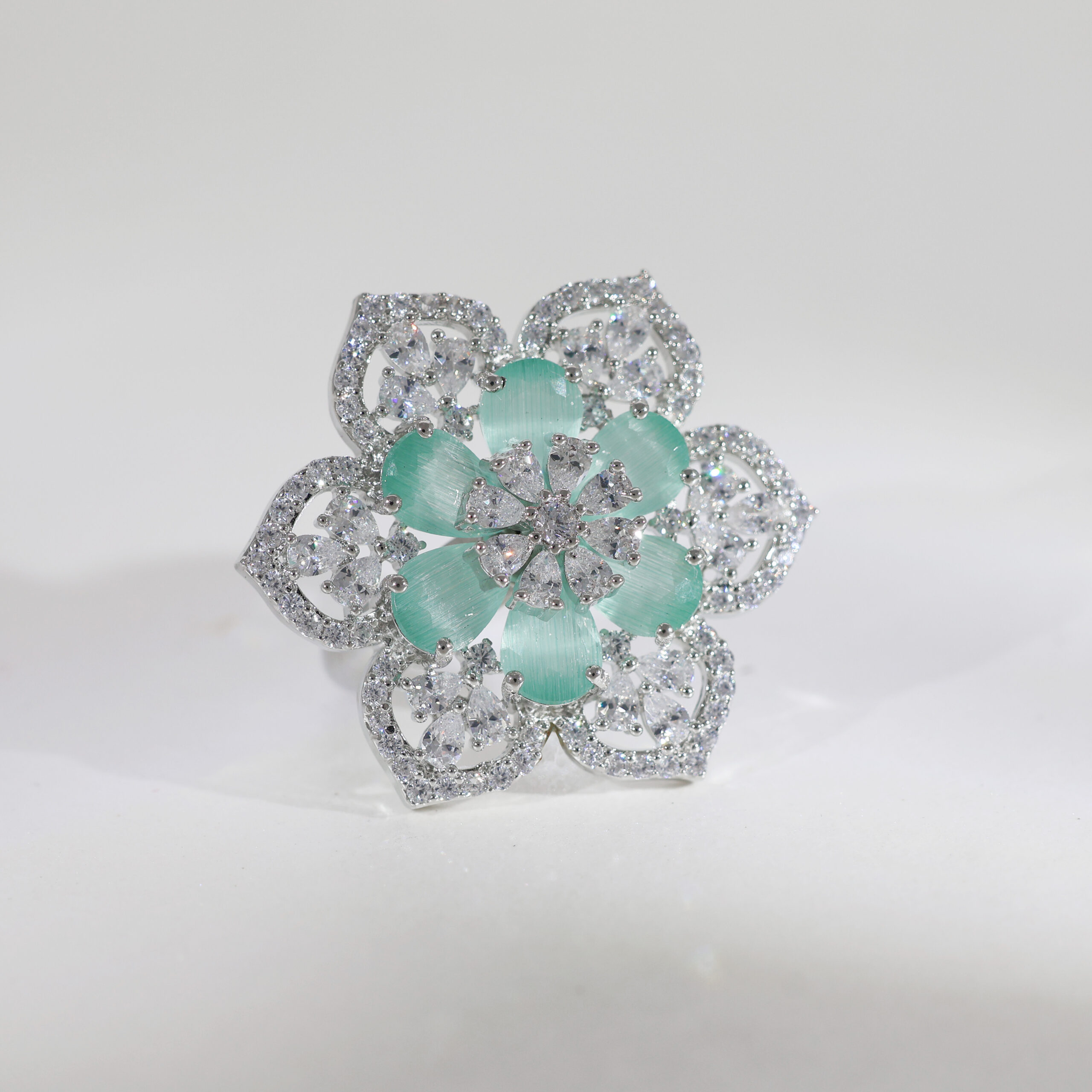 Mint-hued petals bloom from the center, surrounded by diamond-like sparkles that resemble morning frost. Perfect for a subtle yet elegant statement.Highlights: