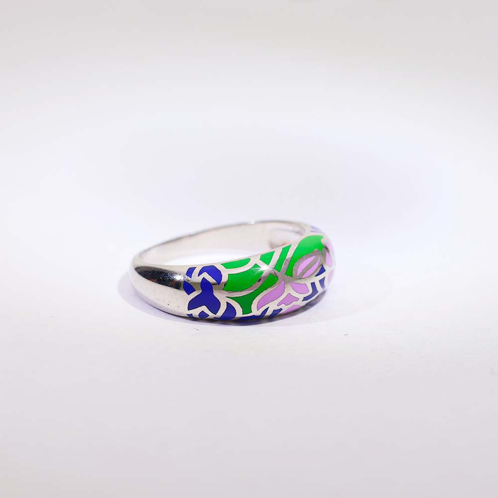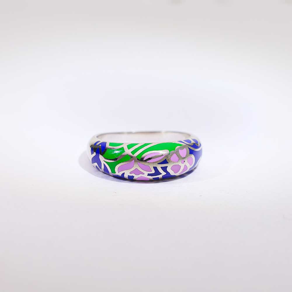 Artful pink petals, green tendrils, and a tranquil blue backdrop come together in a sleek, hand-crafted eternity band.Highlights: