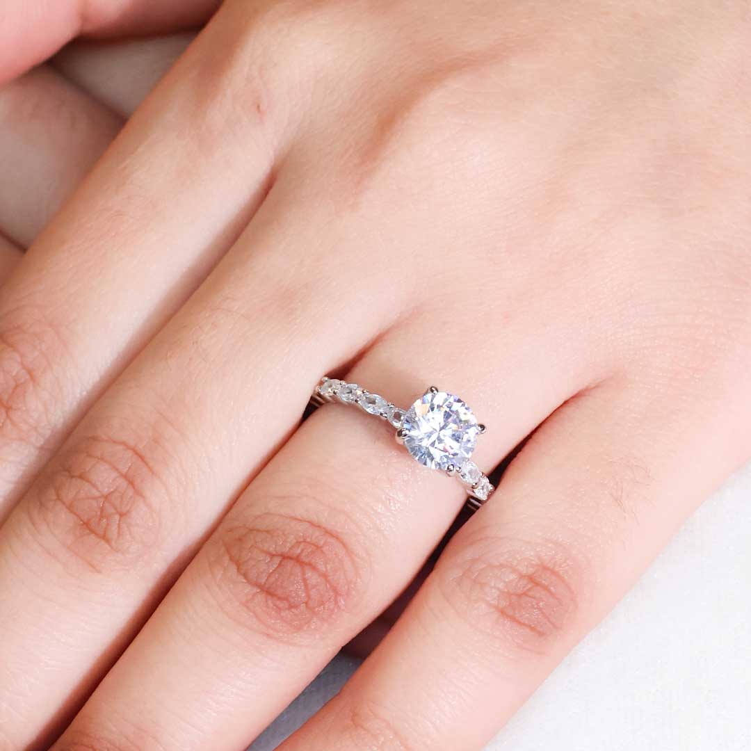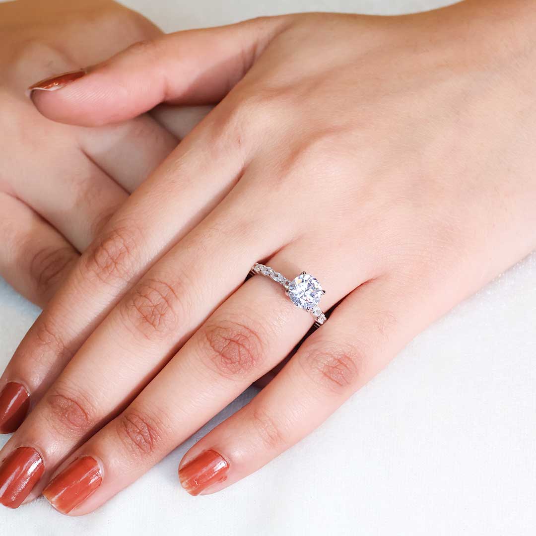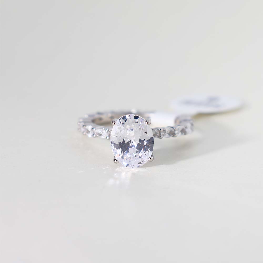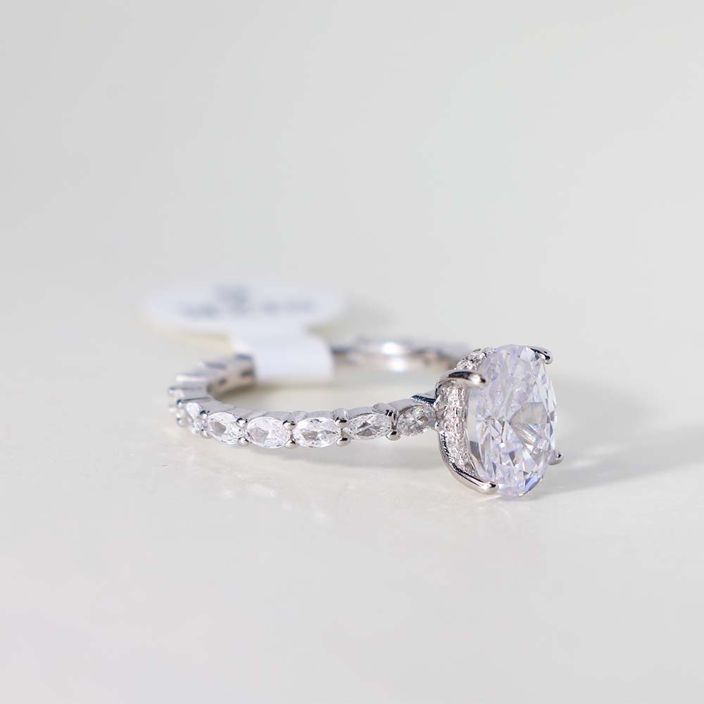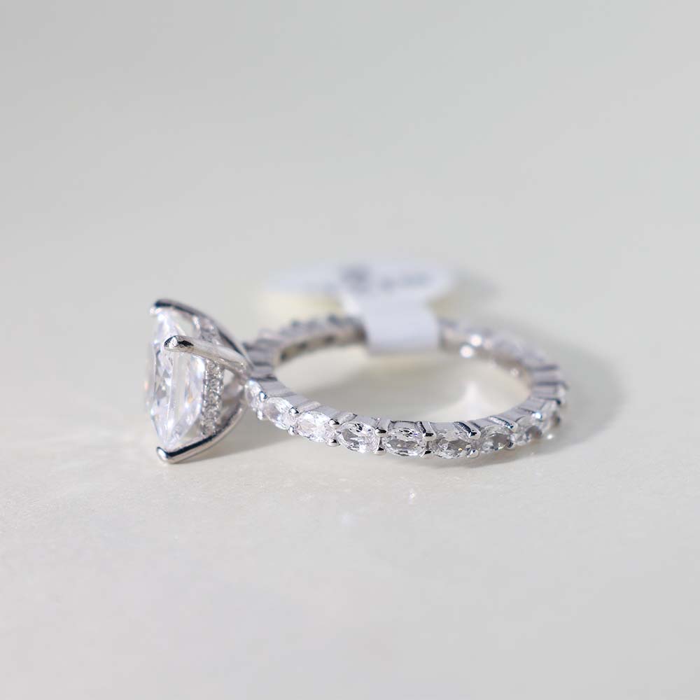 The band of the ring is fully encrusted with smaller, round stones, creating a continuous line of sparkle and enhancing the overall brilliance of the ring. This is likely a pave setting.