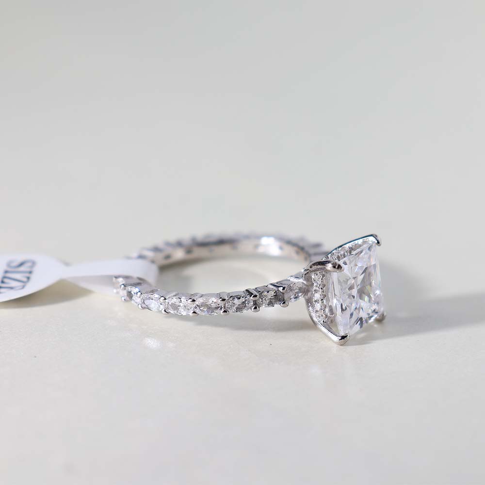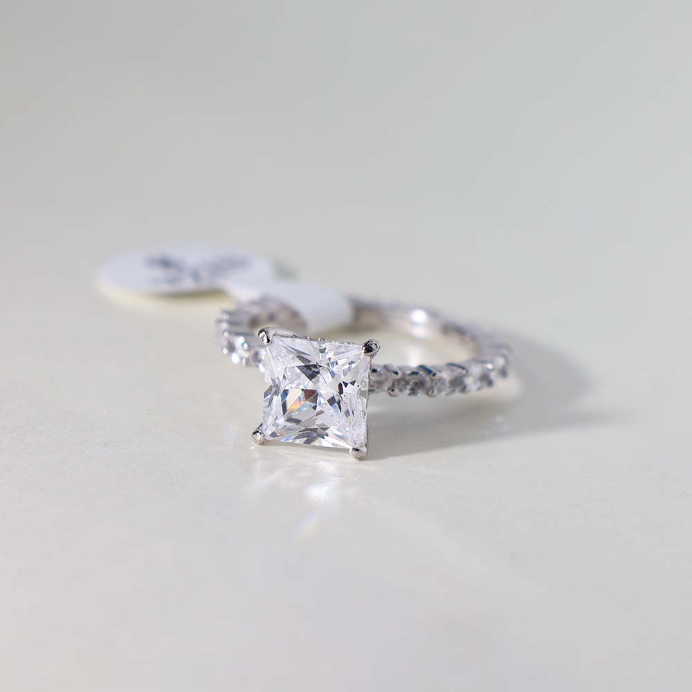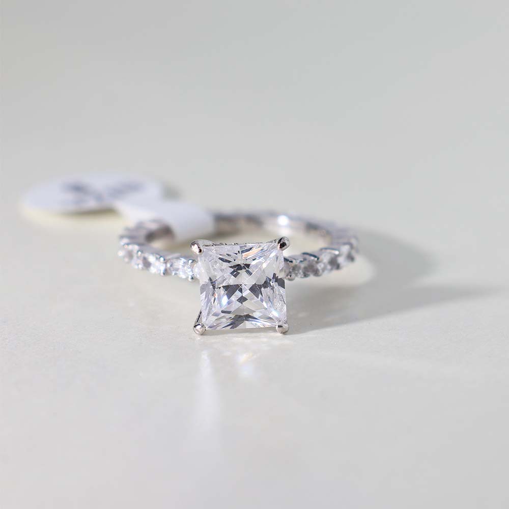 The ring features a prominent princess-cut clear stone, likely a cubic zirconia, white sapphire, or diamond simulant, as its center stone.