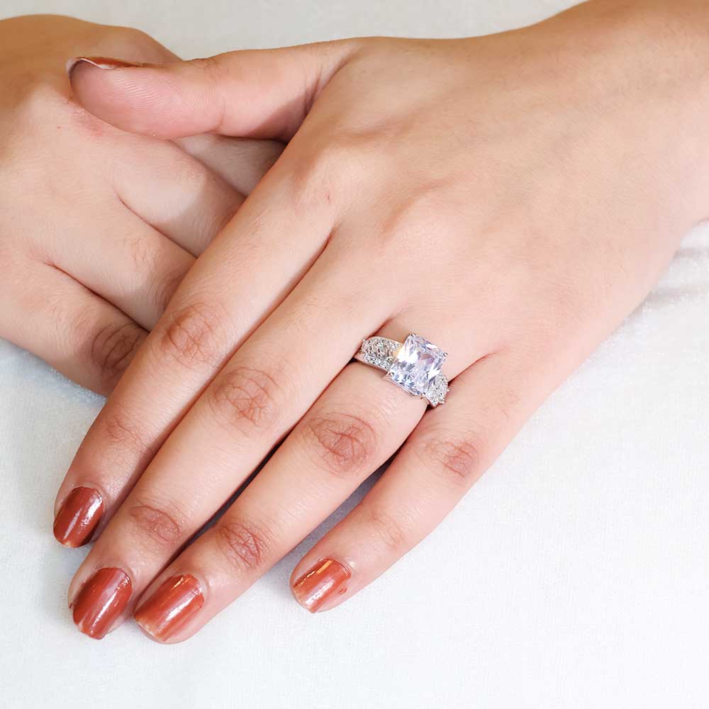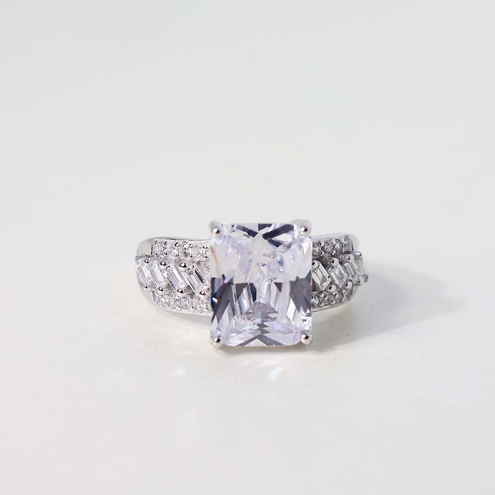 The ring showcases a large, radiant cut stone (likely a diamond simulant or cubic zirconia based on the image) as its centerpiece. The radiant cut offers brilliance similar to a diamond with its many facets.