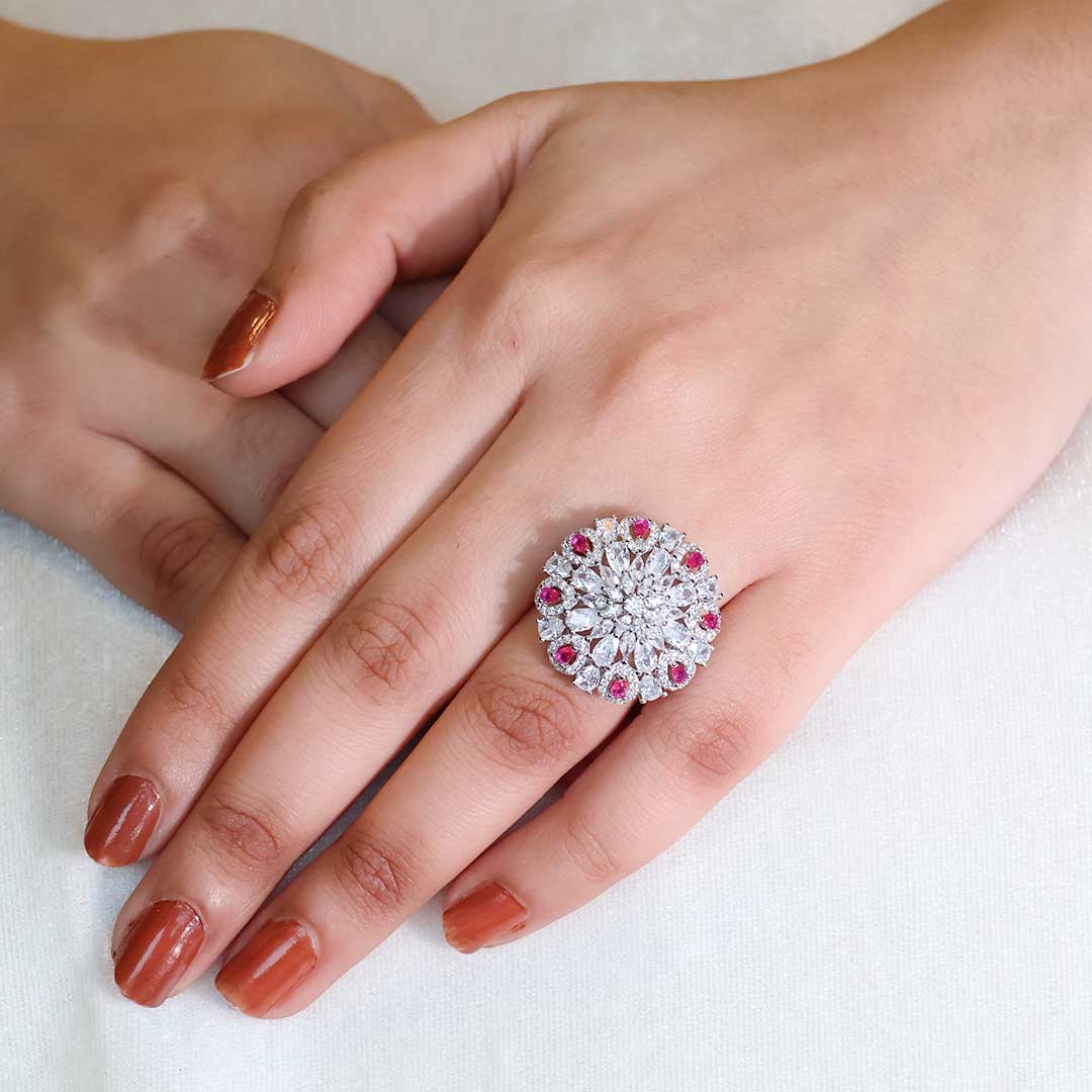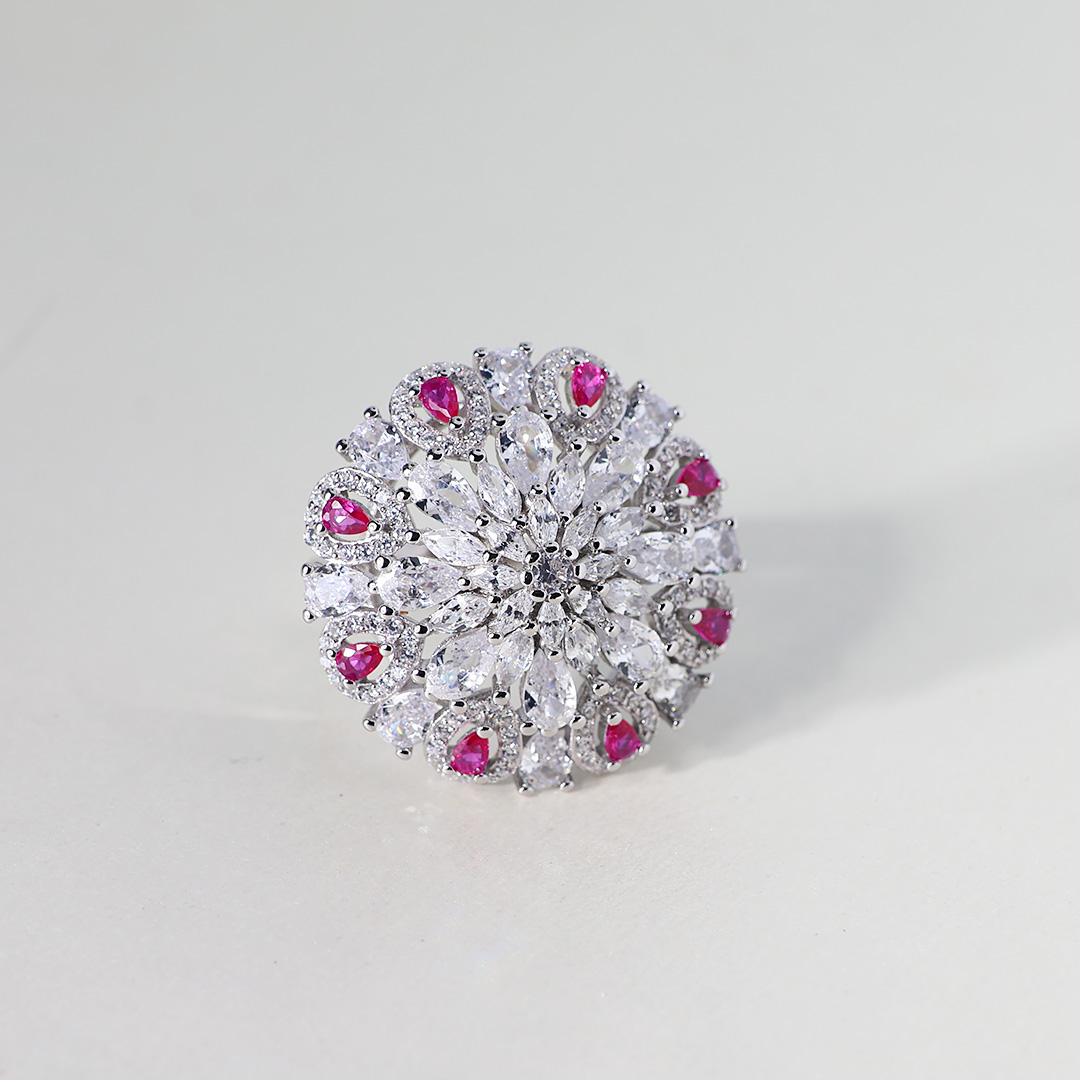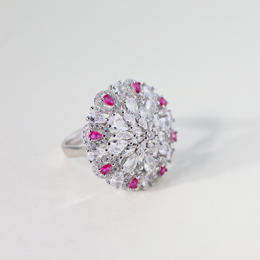 Statement Piece: This ring is definitely a statement piece, designed to attract attention and admiration. Its unique design and combination of sparkle and color make it a conversation starter.