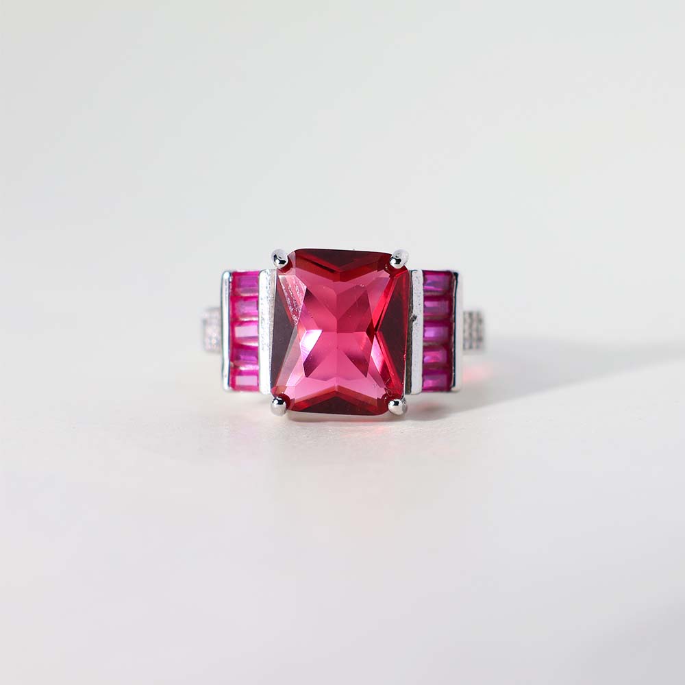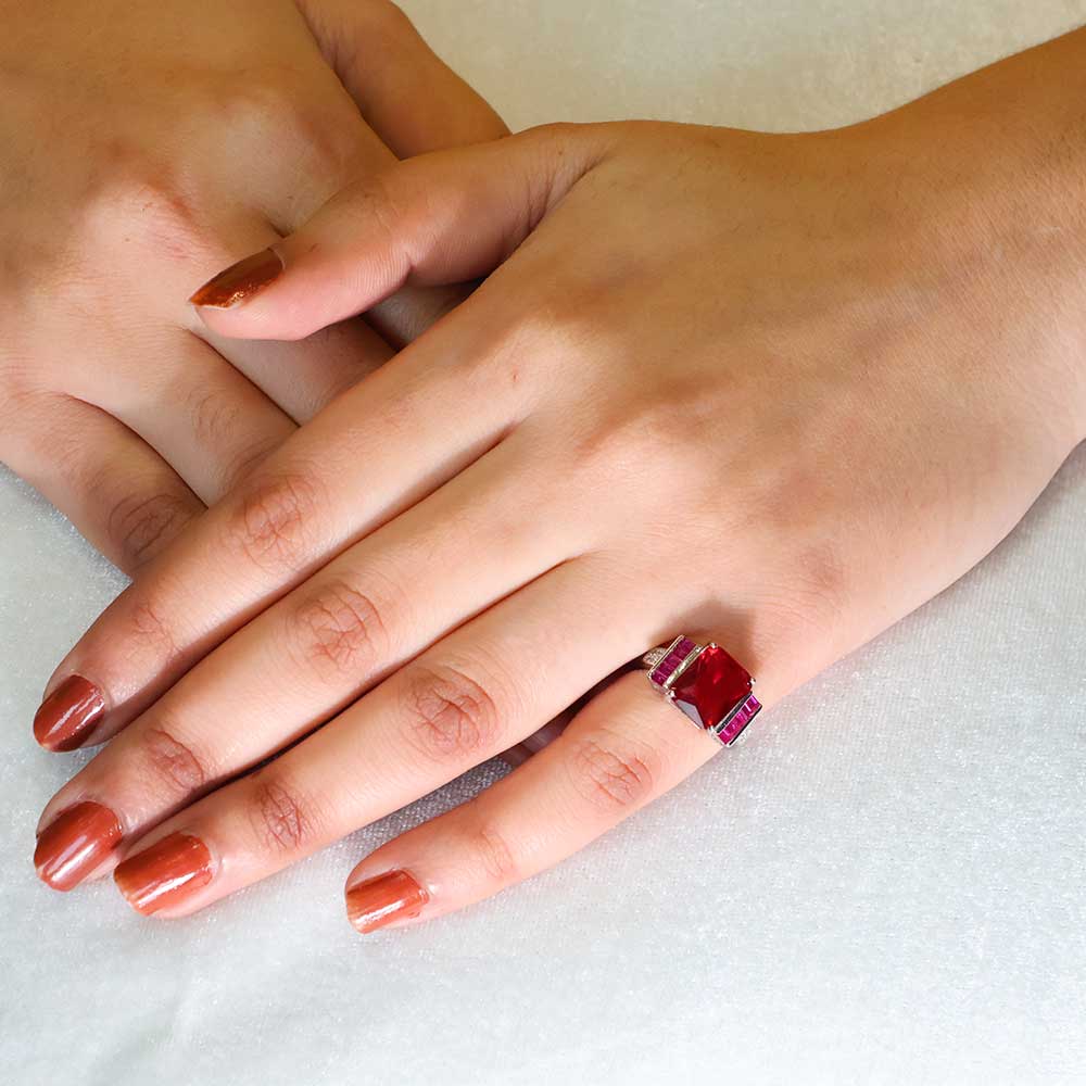 The rich, vibrant red hue of the center stone creates a bold and luxurious look.
