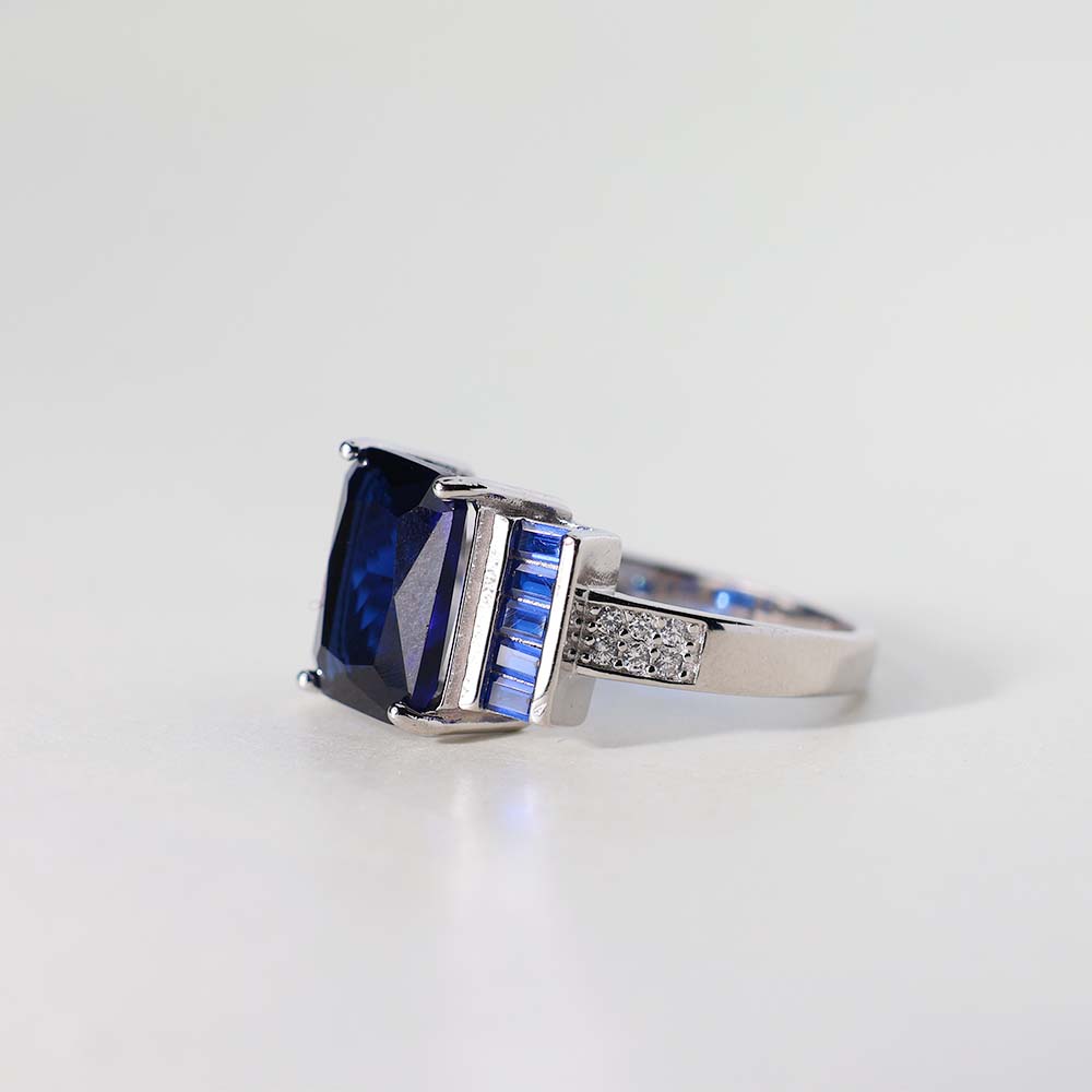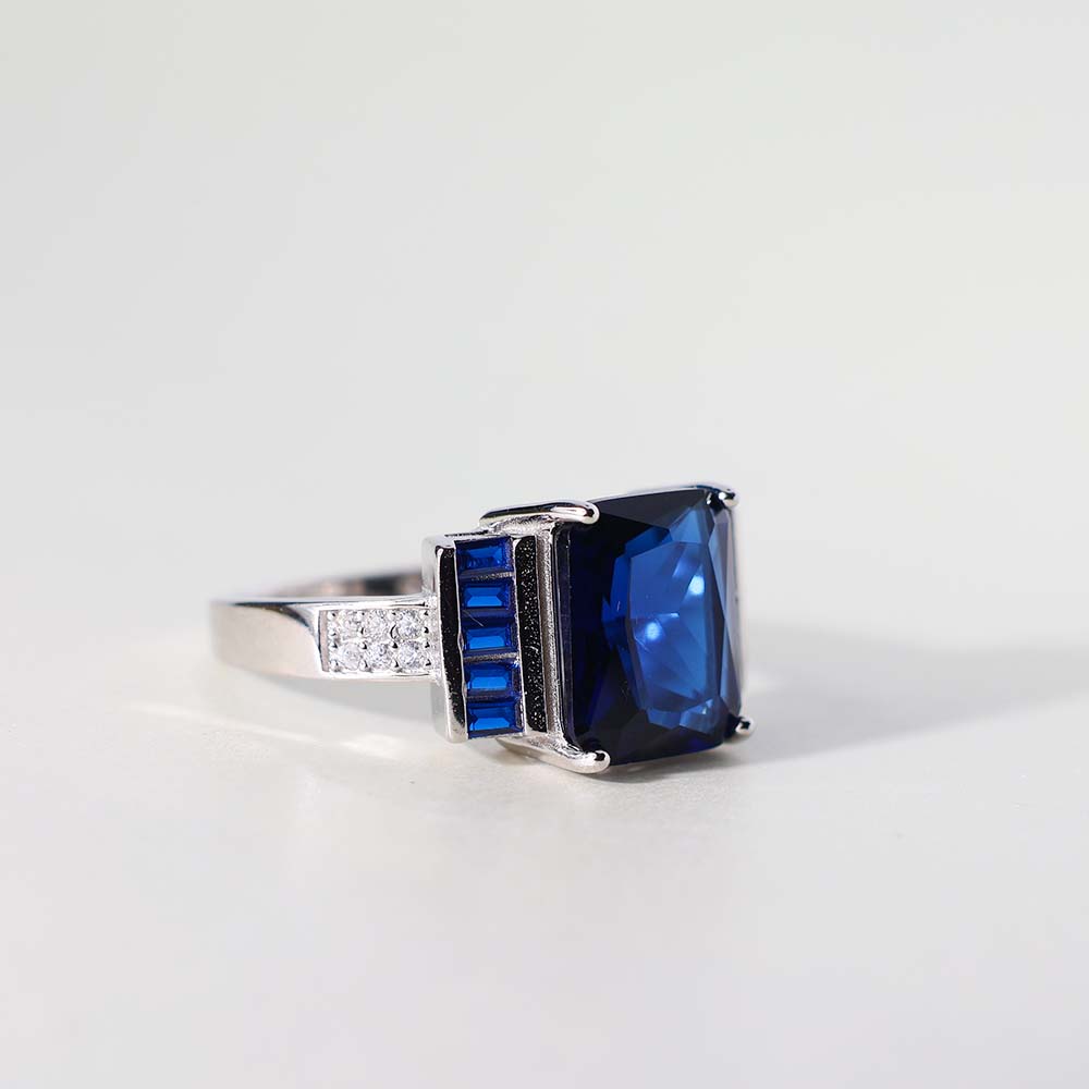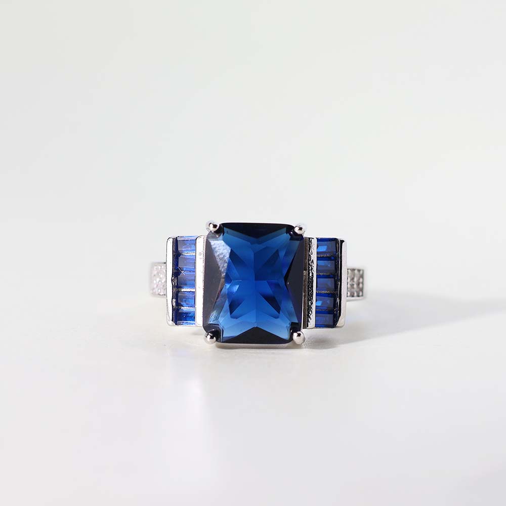The ring features a large, emerald-cut blue gemstone, likely a sapphire, as its central stone.