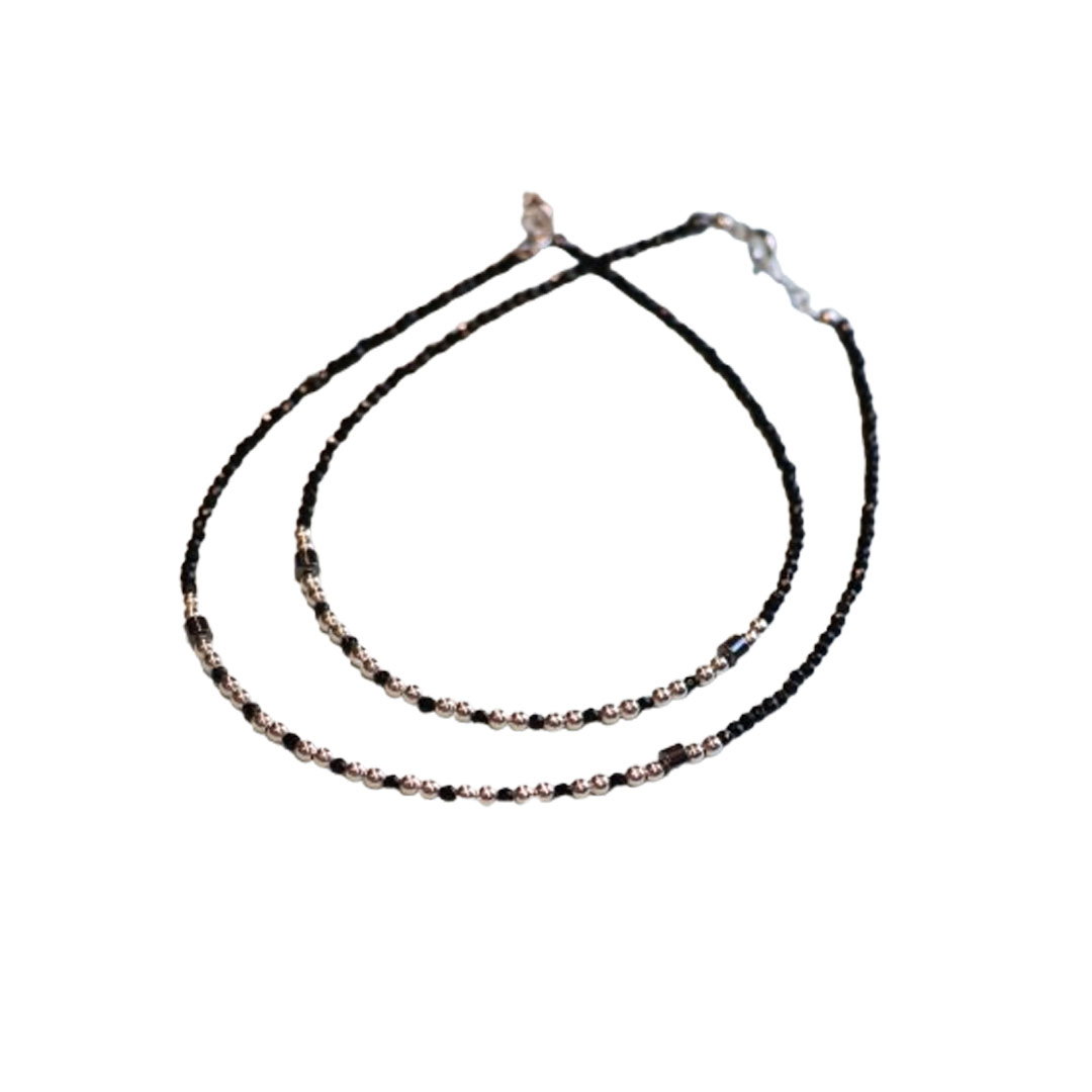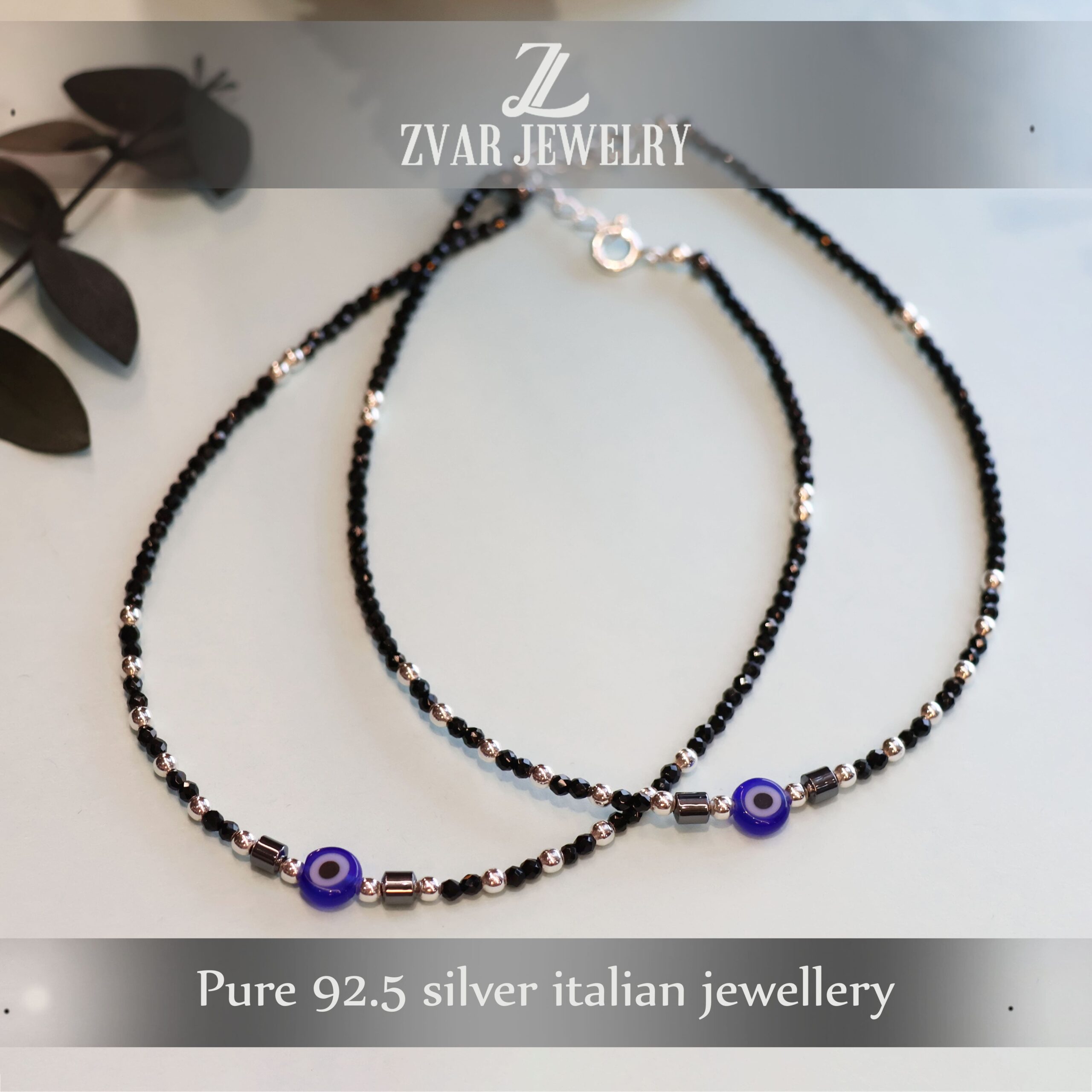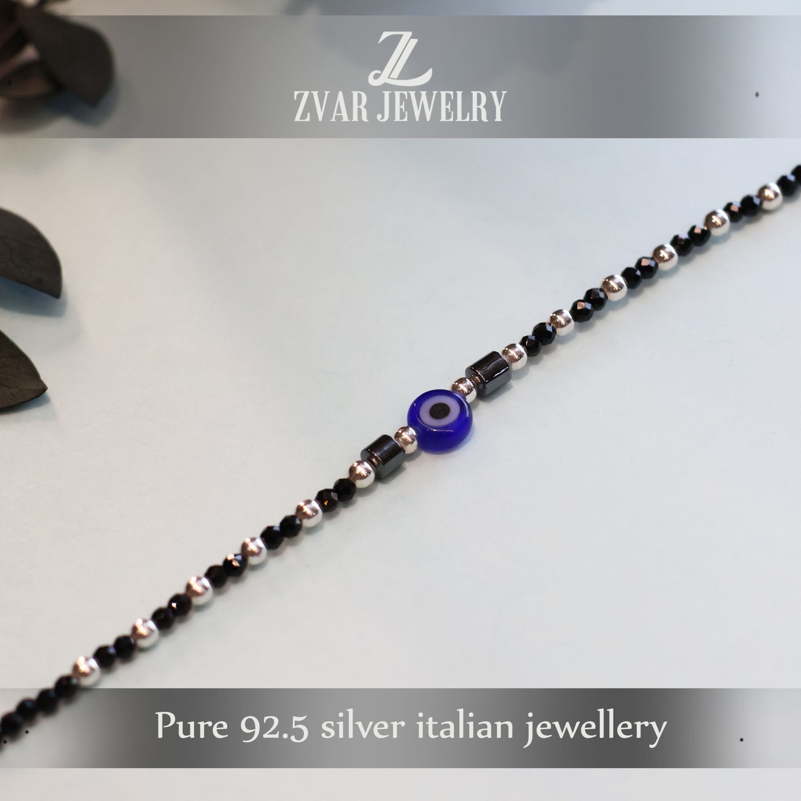 This silver anklet features black beads and an evil eye motif at the centre.