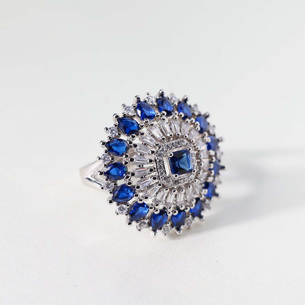 A deep blue, likely star sapphire (though the asterism isn’t visible in this image, the color and cut suggest it), takes center stage, providing a rich, captivating hue. It is important to note that this is an assumption based on the color and potential cut. Confirmation of a star sapphire would require further examination.