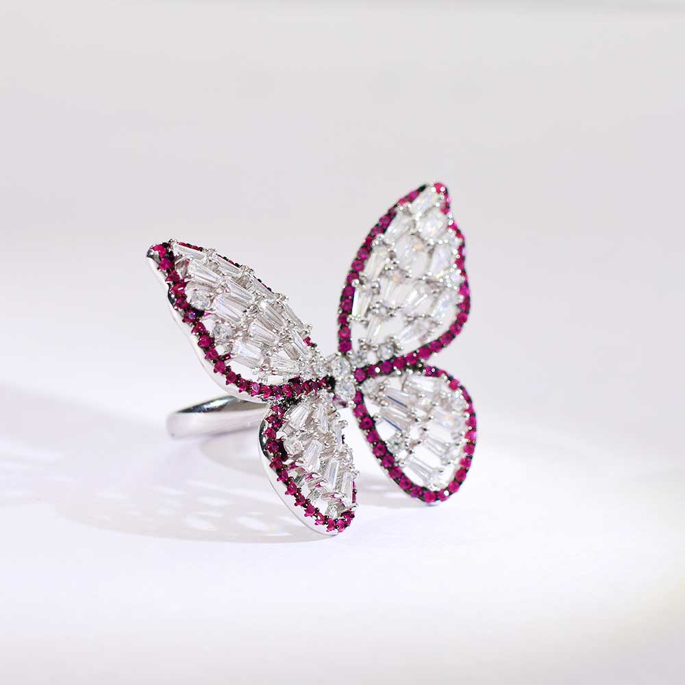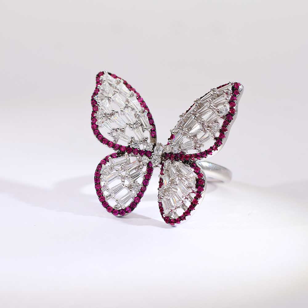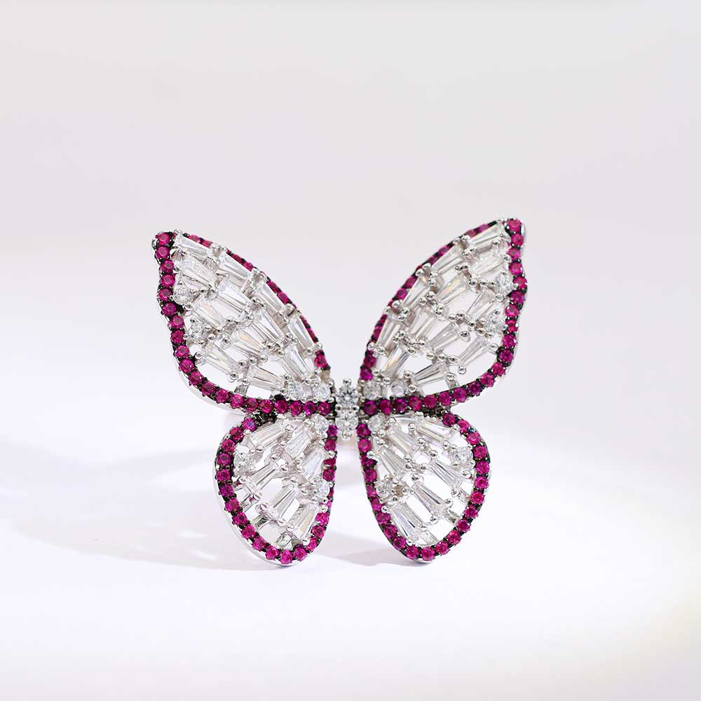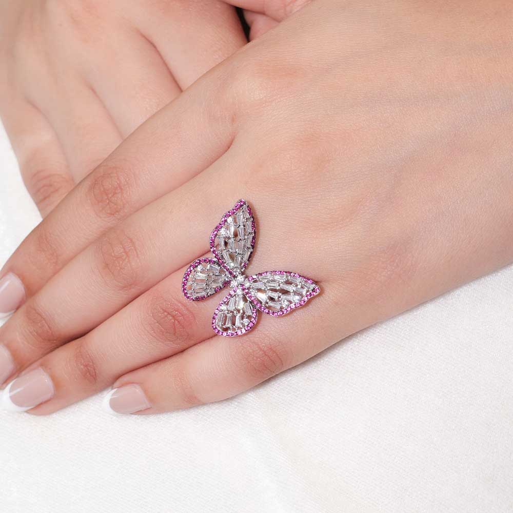 This statement butterfly ring blends icy baguette stones with a glowing pink outline, resting elegantly on polished 925 silver.-