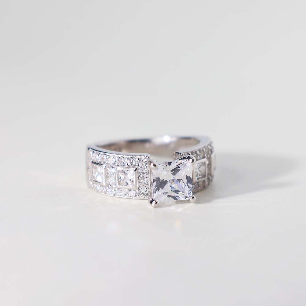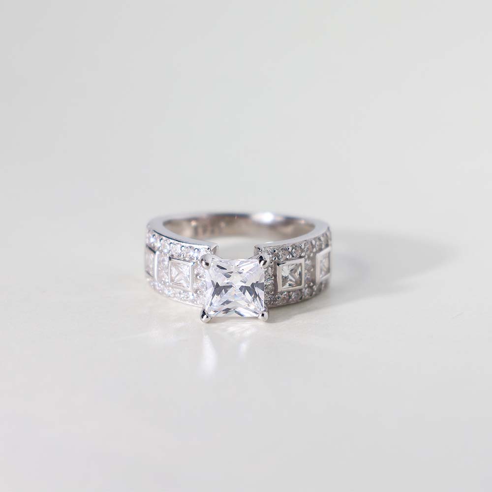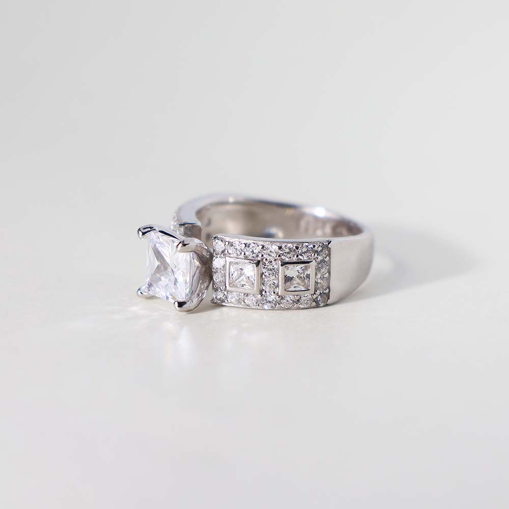 The ring features a prominent princess-cut clear stone as its central stone.