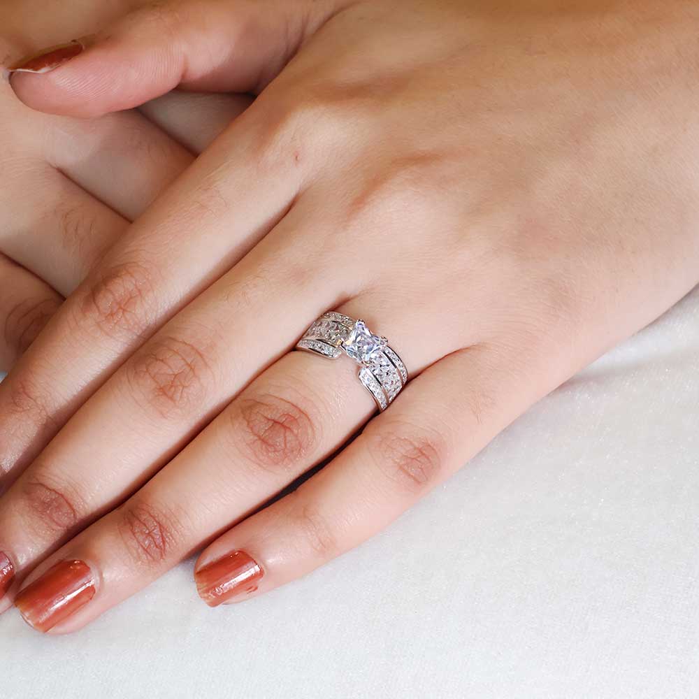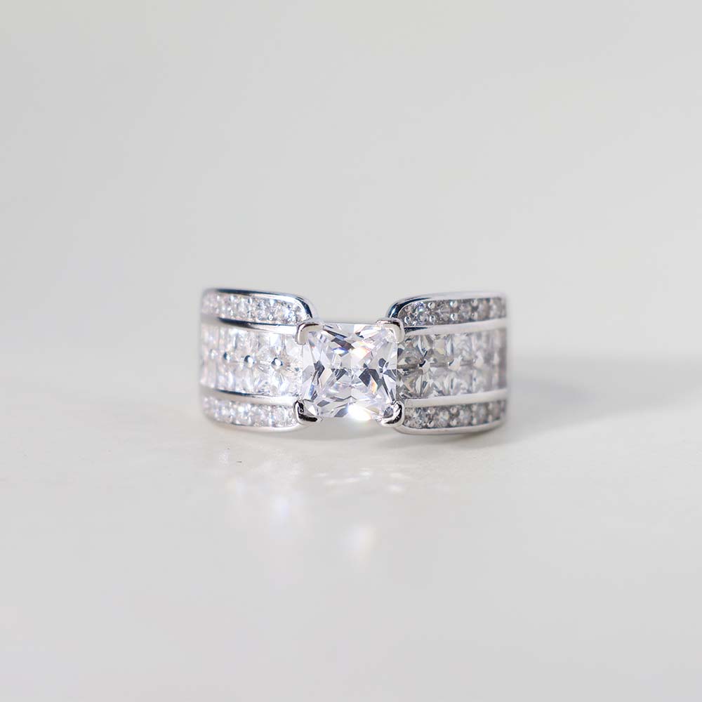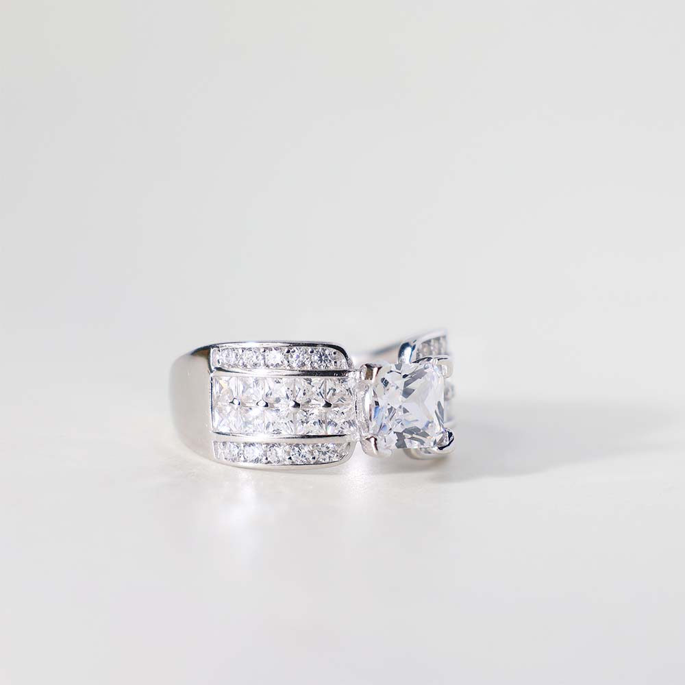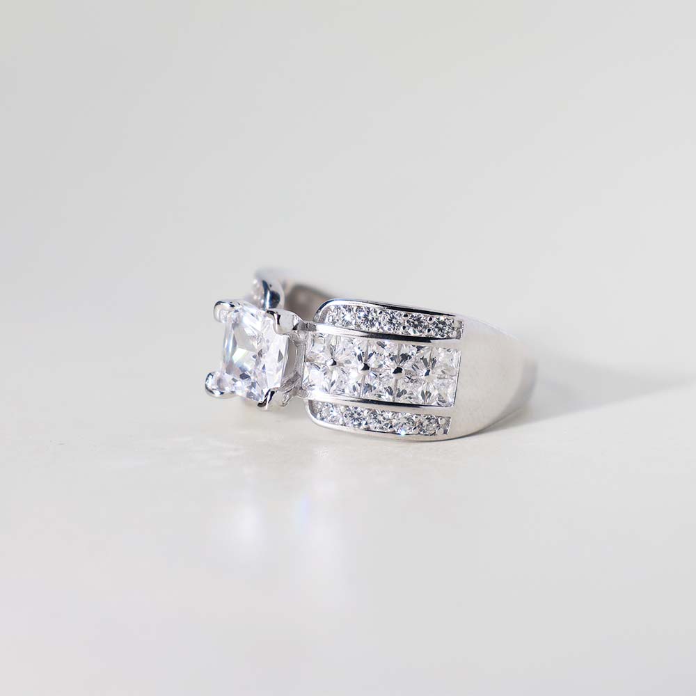 The ring features a prominent princess-cut clear stone as its central stone.
