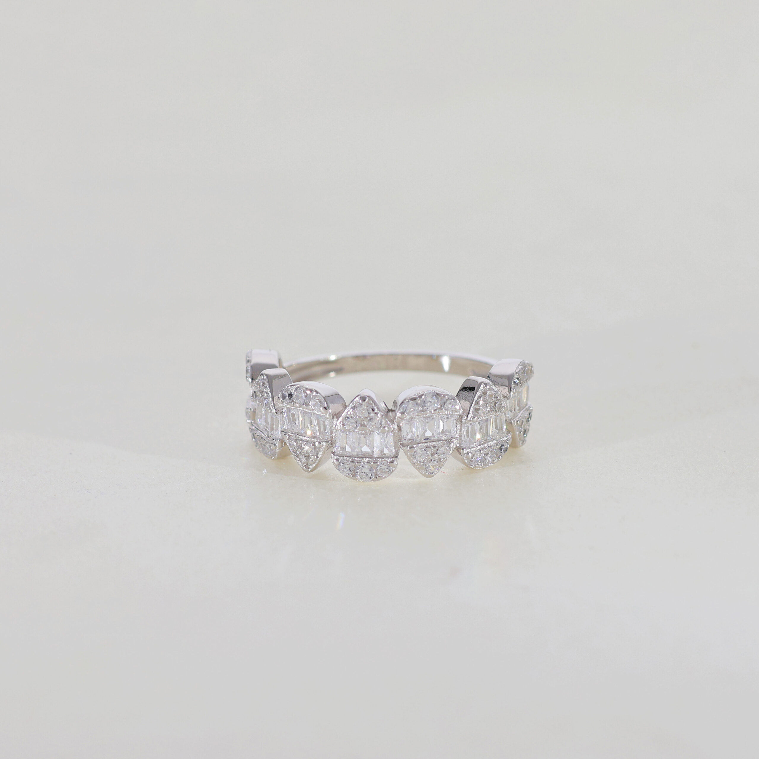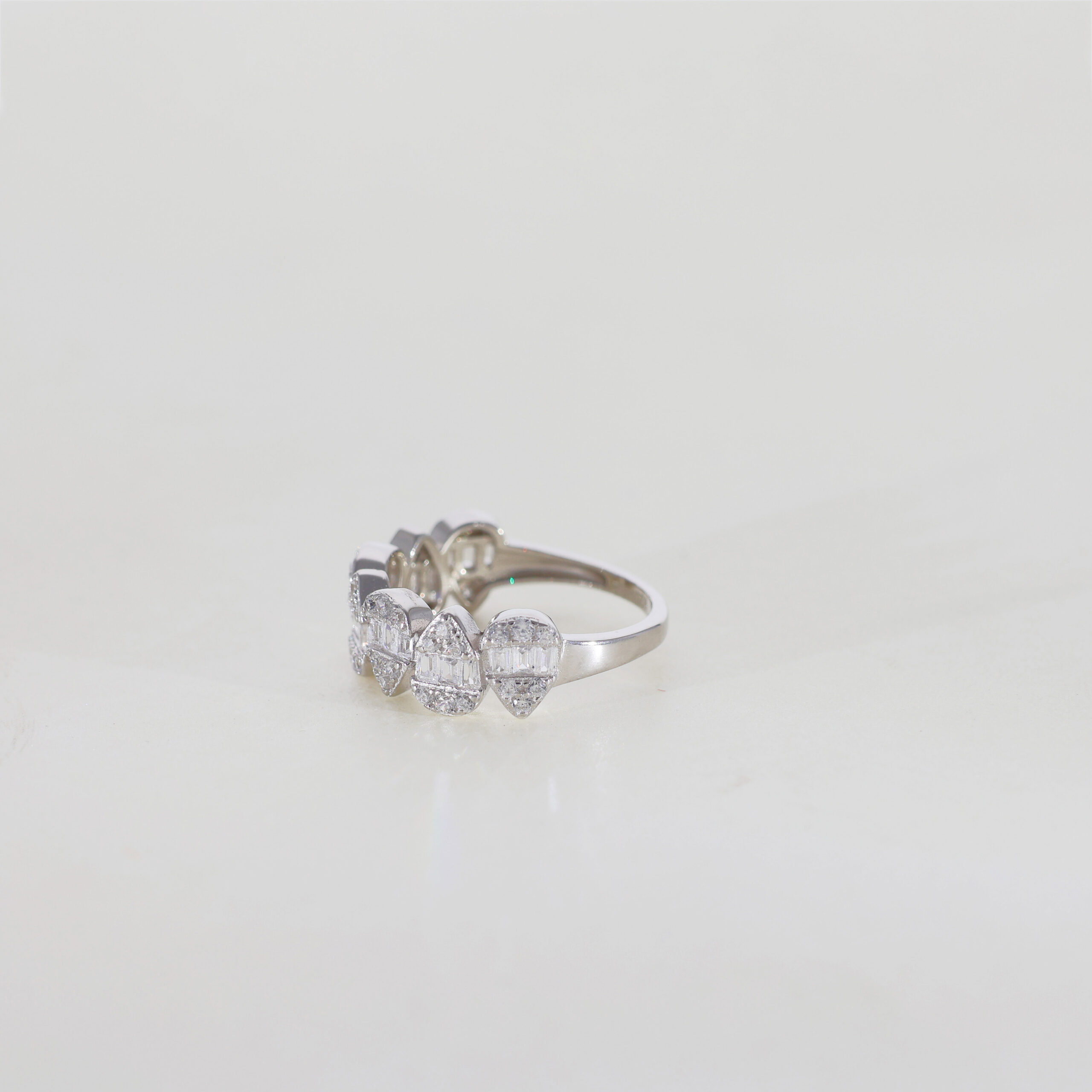 Alternating Diamond Cuts: The ring features an alternating pattern of diamond cuts, likely baguette and trapezoid or kite shapes. This creates a visually dynamic and interesting design.