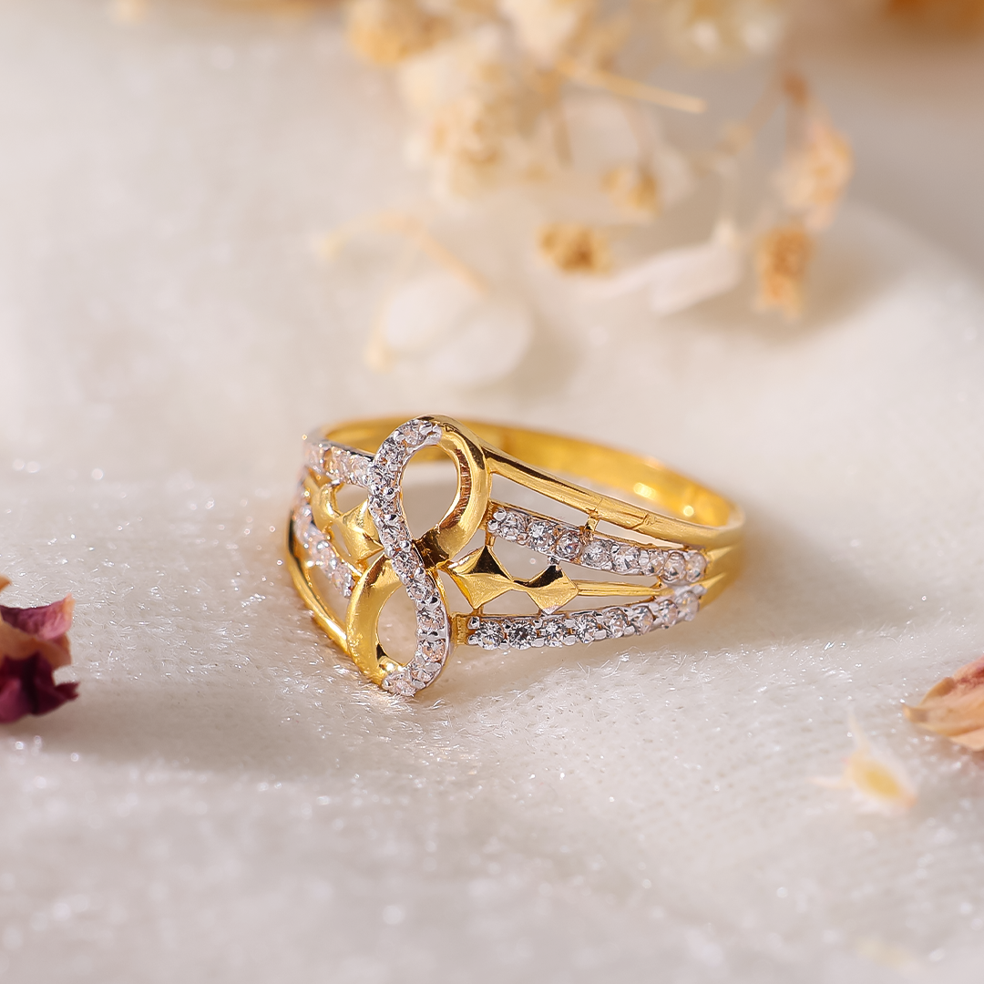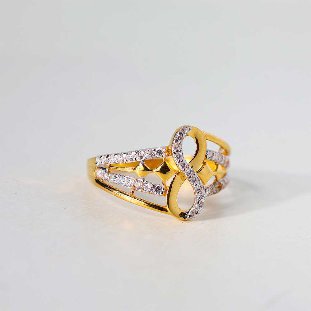 Crafted in radiant 22KT 916 hallmarked gold, this ring features an elegant infinity motif, adorned with shimmering stone accents that reflect light with every gesture. Designed to represent everlasting love, its flowing curves and sparkling brilliance make it a piece that speaks louder than words.