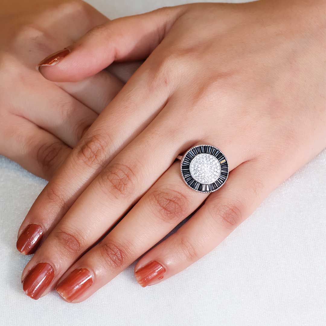 A circle of shimmering crystals bordered by sleek black baguettes on 925 silver, crafted to exude royalty and charm.