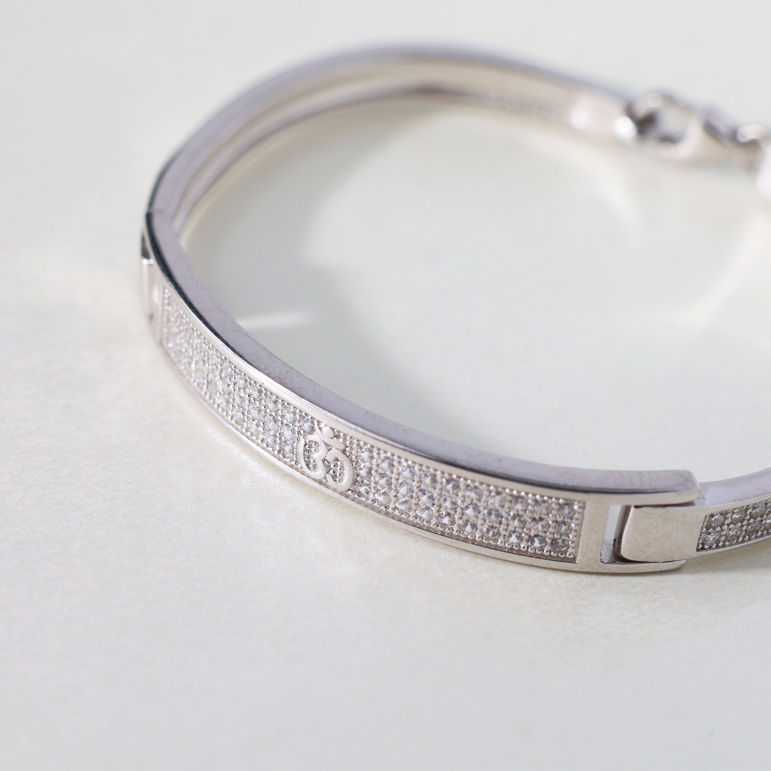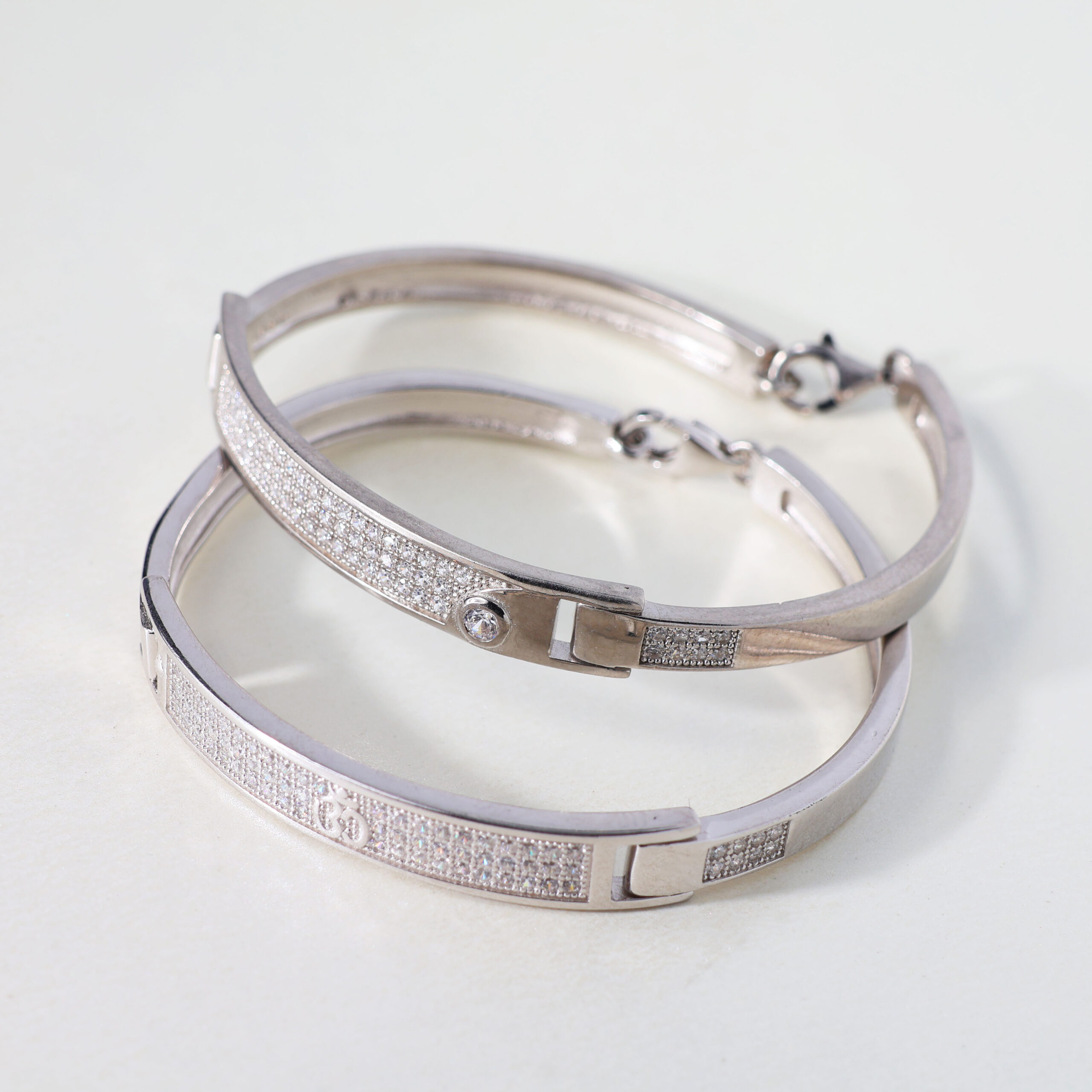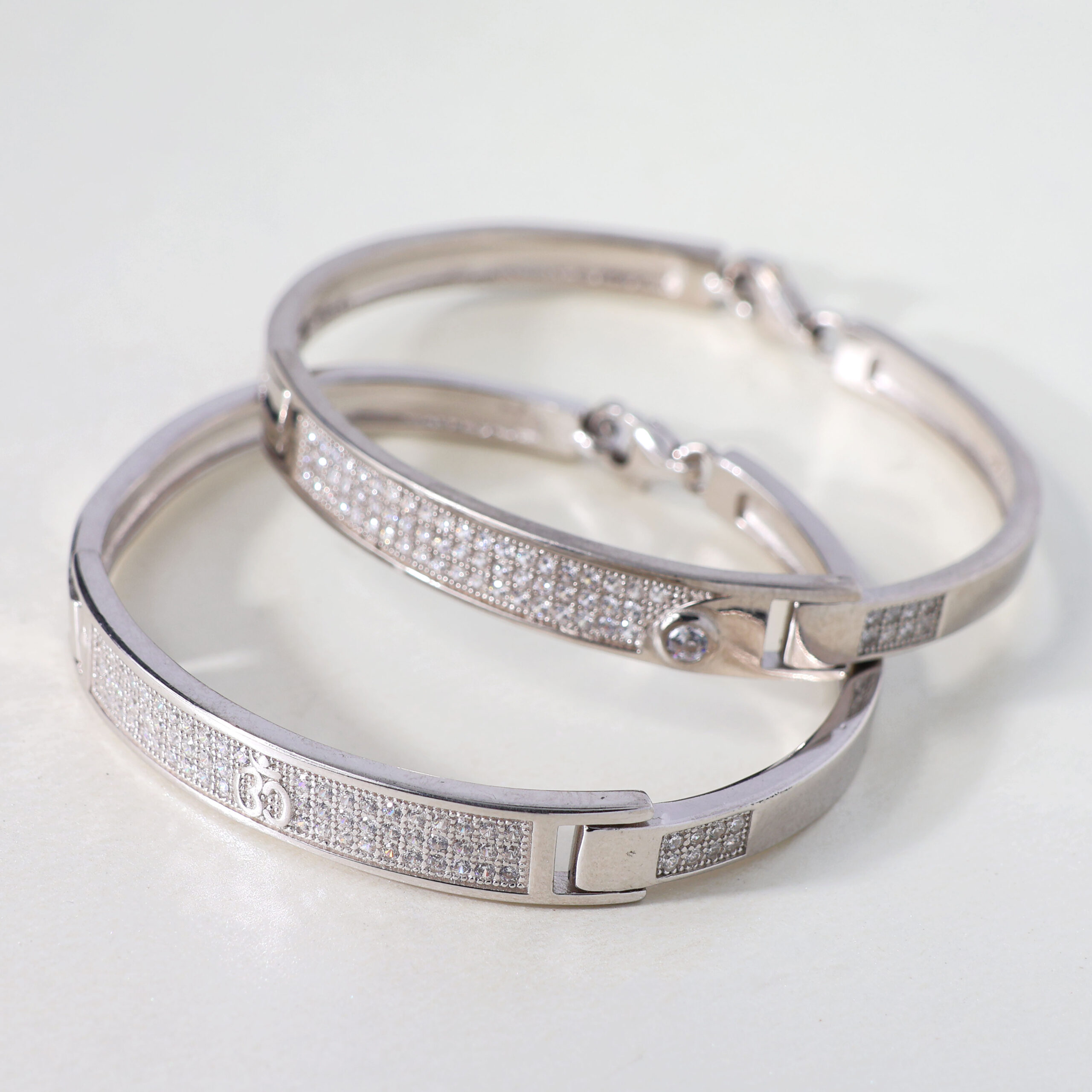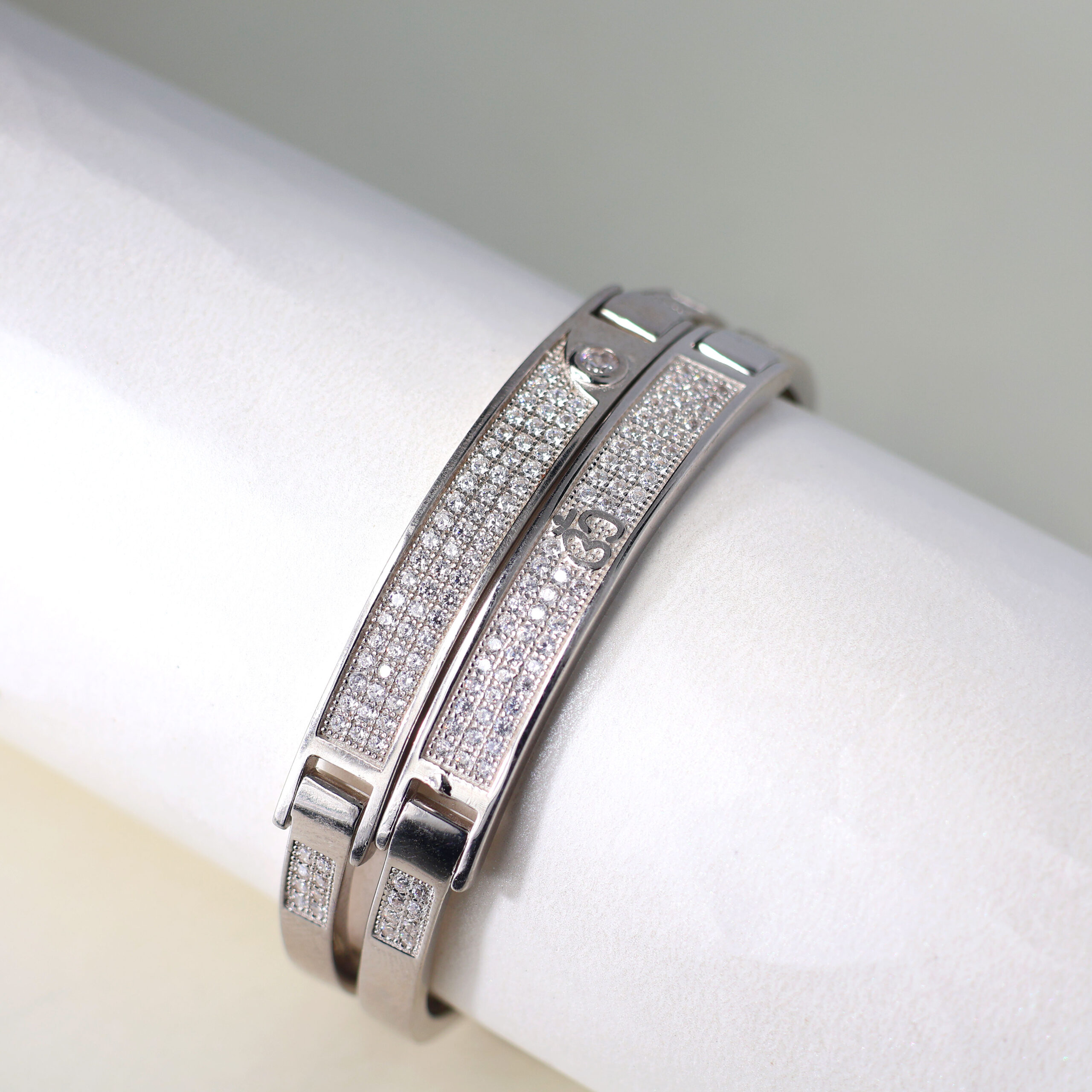 Design: Clean, rectangular silver bands with pavé crystal accents and a secure clasp — elegance meets everyday security.