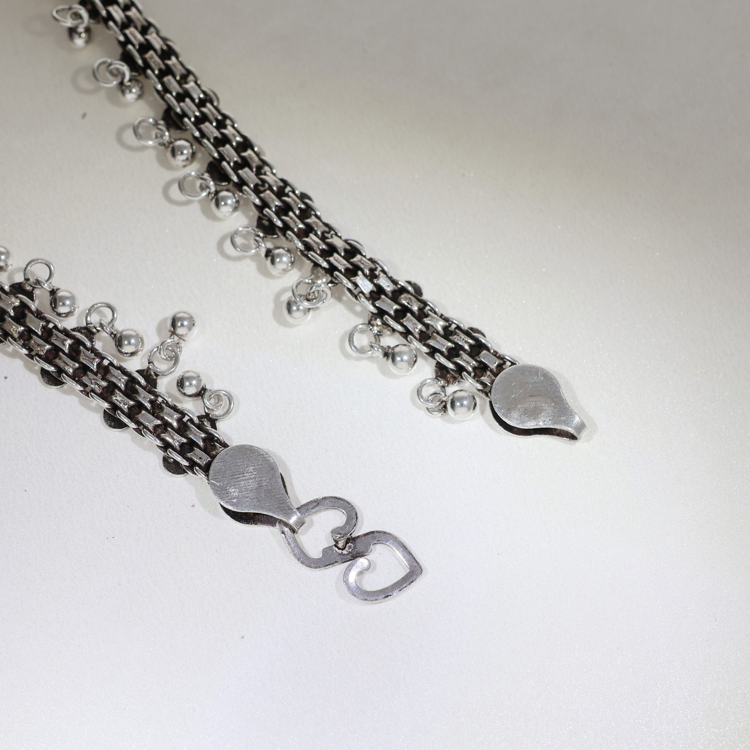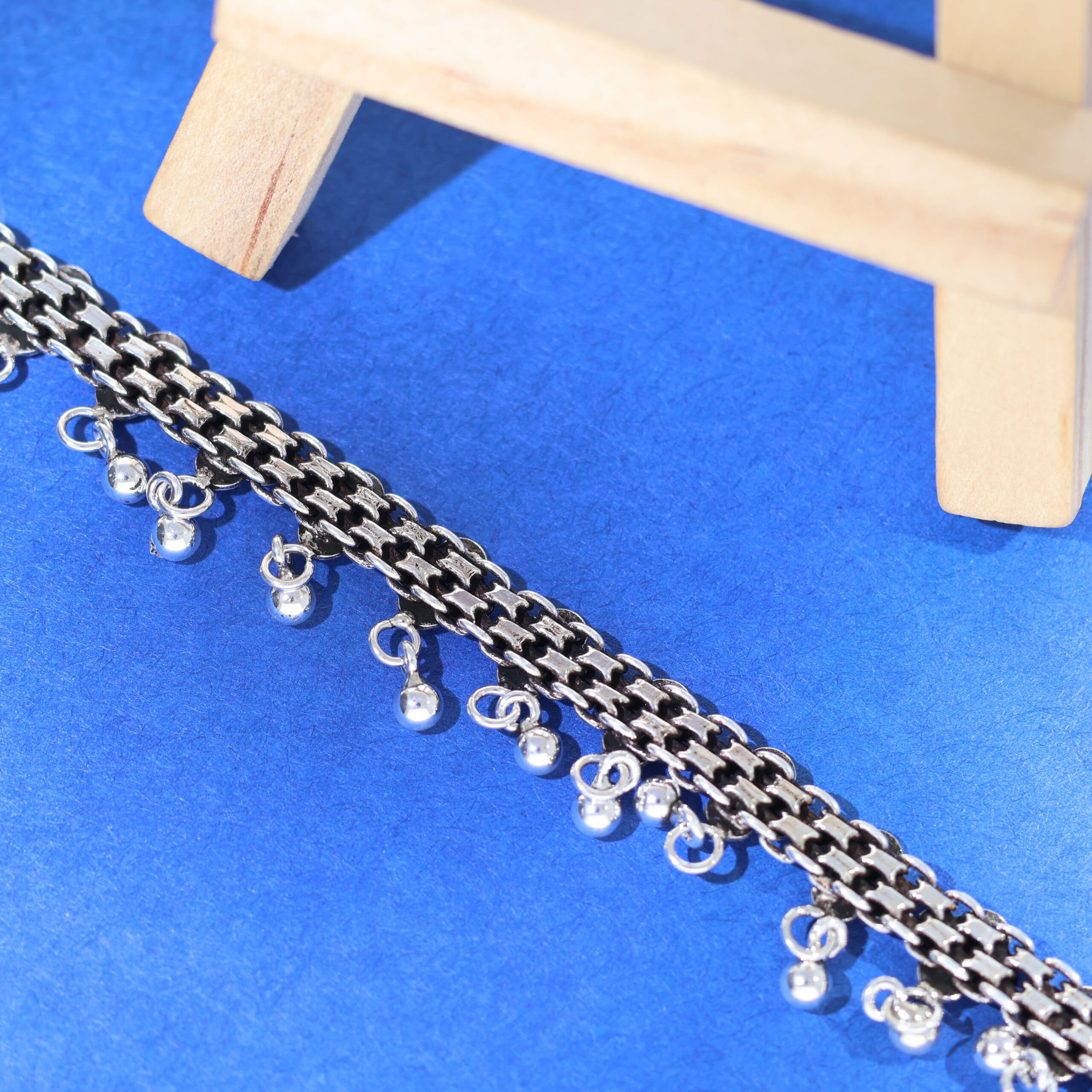 Description: A stunning piece of jewelry, this vintage-inspired anklet is designed to elevate your look with its intricate detailing and dangling silver drops. The finely crafted floral and geometric patterns add a touch of sophistication, while the drop accents bring movement and charm. Made from premium-quality silver, it is durable and tarnish-resistant, ensuring long-lasting beauty. Perfect for weddings, festivals, or casual outings, this anklet seamlessly complements traditional as well as contemporary attire. Its secure yet stylish clasp ensures a snug fit, allowing you to wear it comfortably throughout the day. Add this elegant anklet to your collection for a timeless and graceful statement.